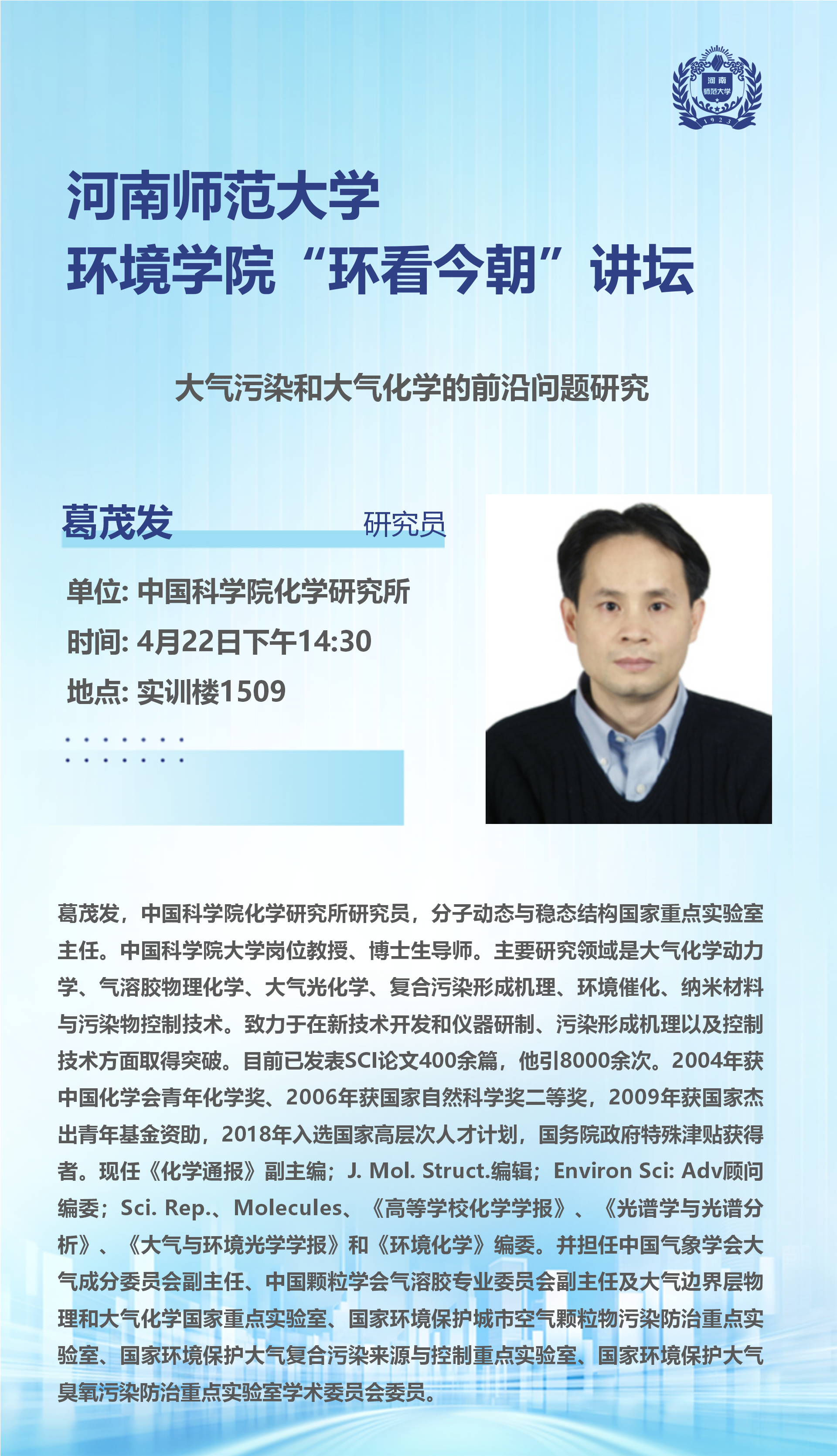 中国科学院化学研究所葛茂发研究员将应邀做客“环看今朝”讲坛