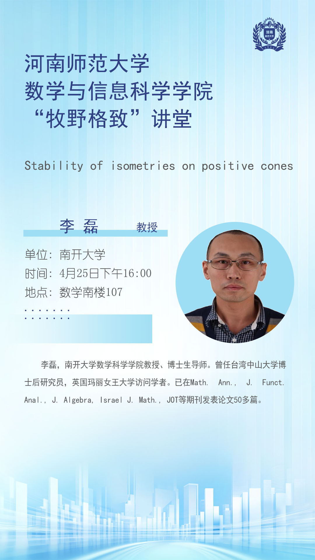 南开大学李磊教授将应邀做客“牧野格致”讲堂