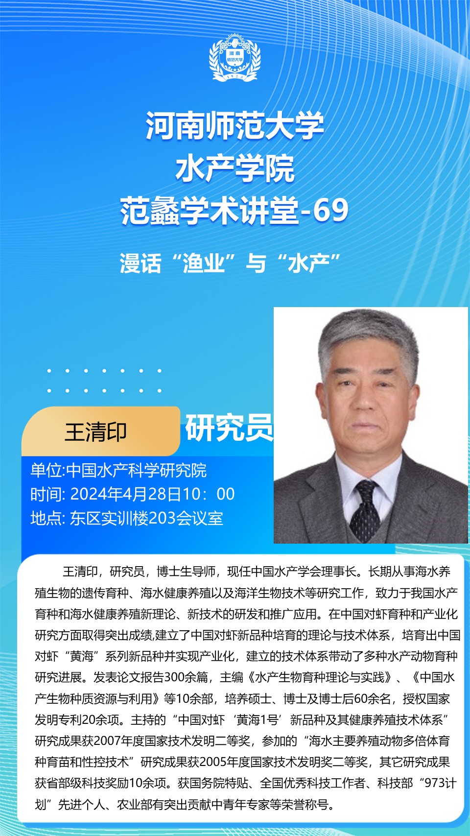 中国水产科学研究院王清印研究员将应邀做客“范蠡学术讲堂”