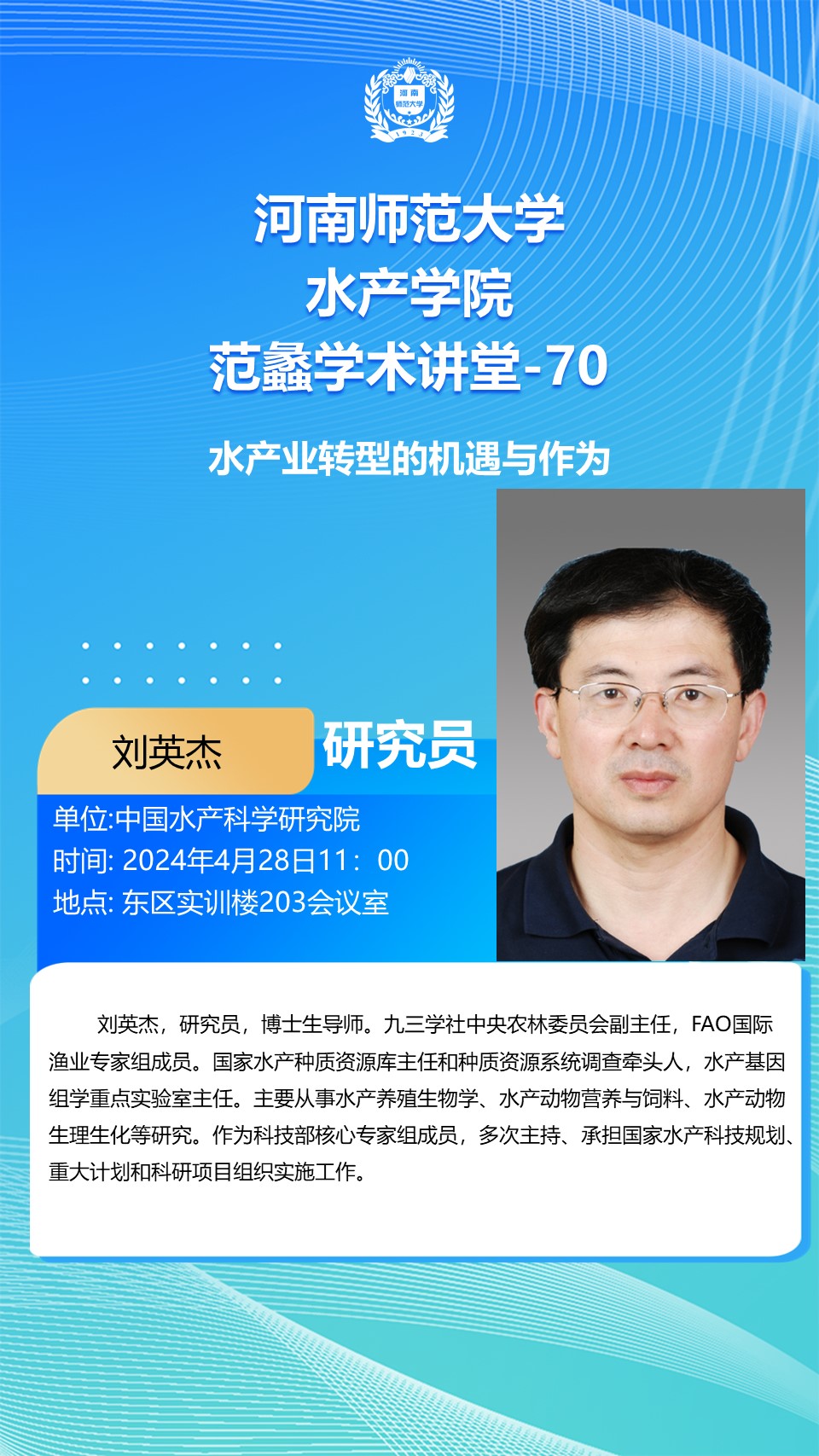 中国水产科学研究院刘英杰研究员将应邀做客“范蠡学术讲堂”