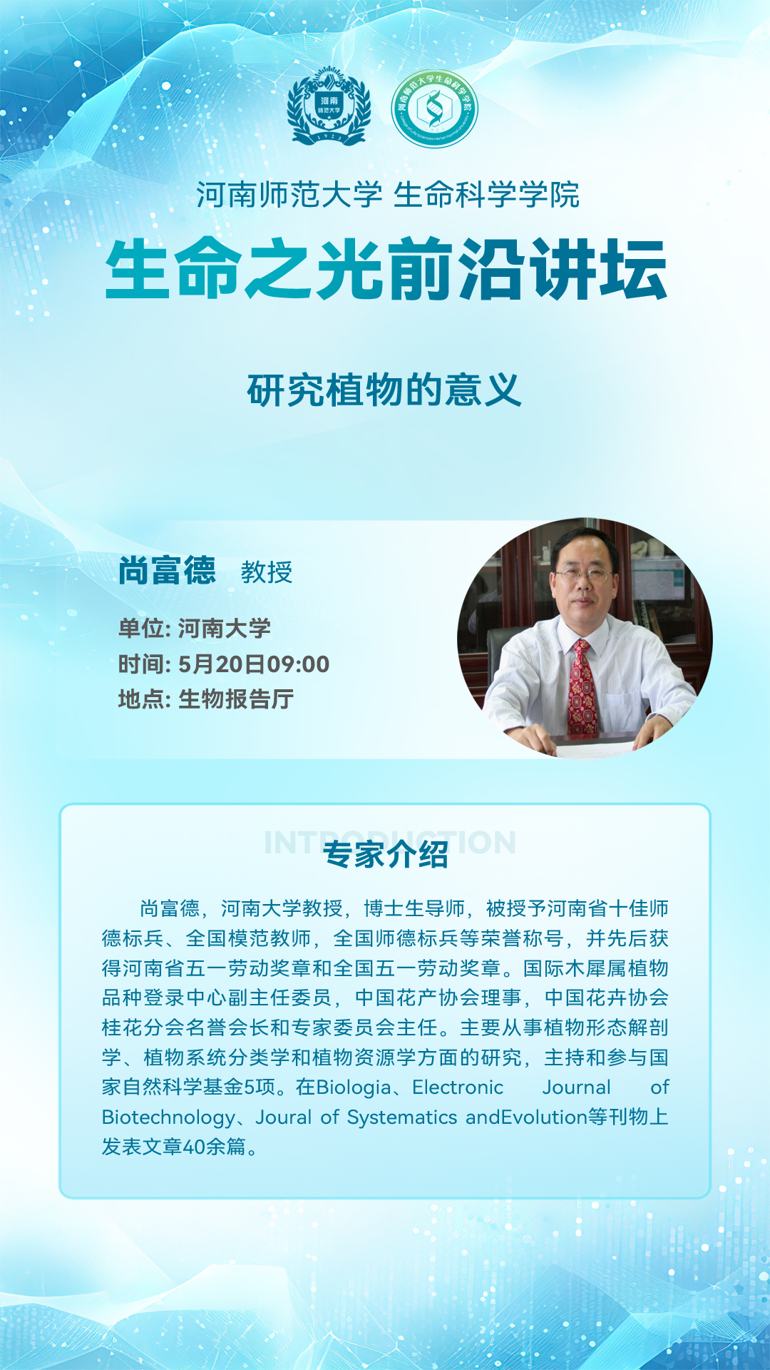 河南大学尚富德教授将应邀做客“生命之光前沿讲坛”