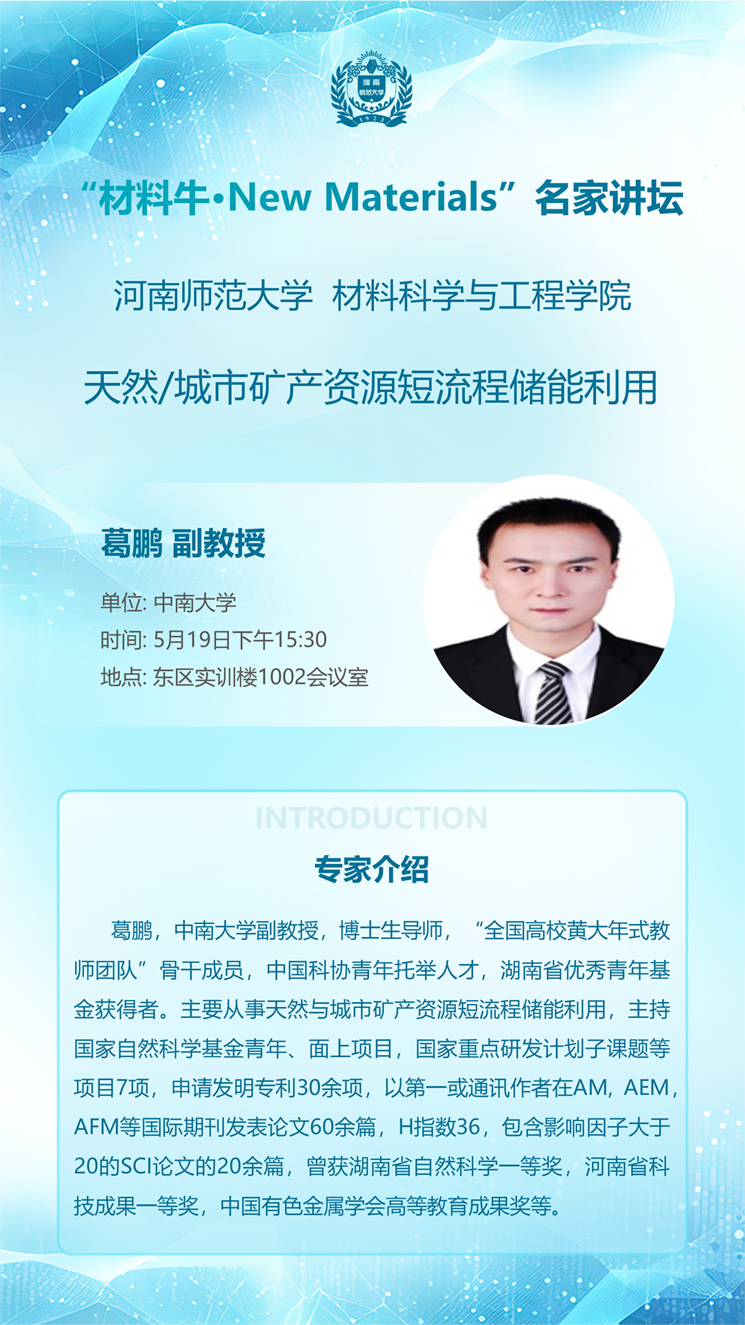 中南大学葛鹏副教授将应邀做客“材料牛·New Materials”名家讲坛