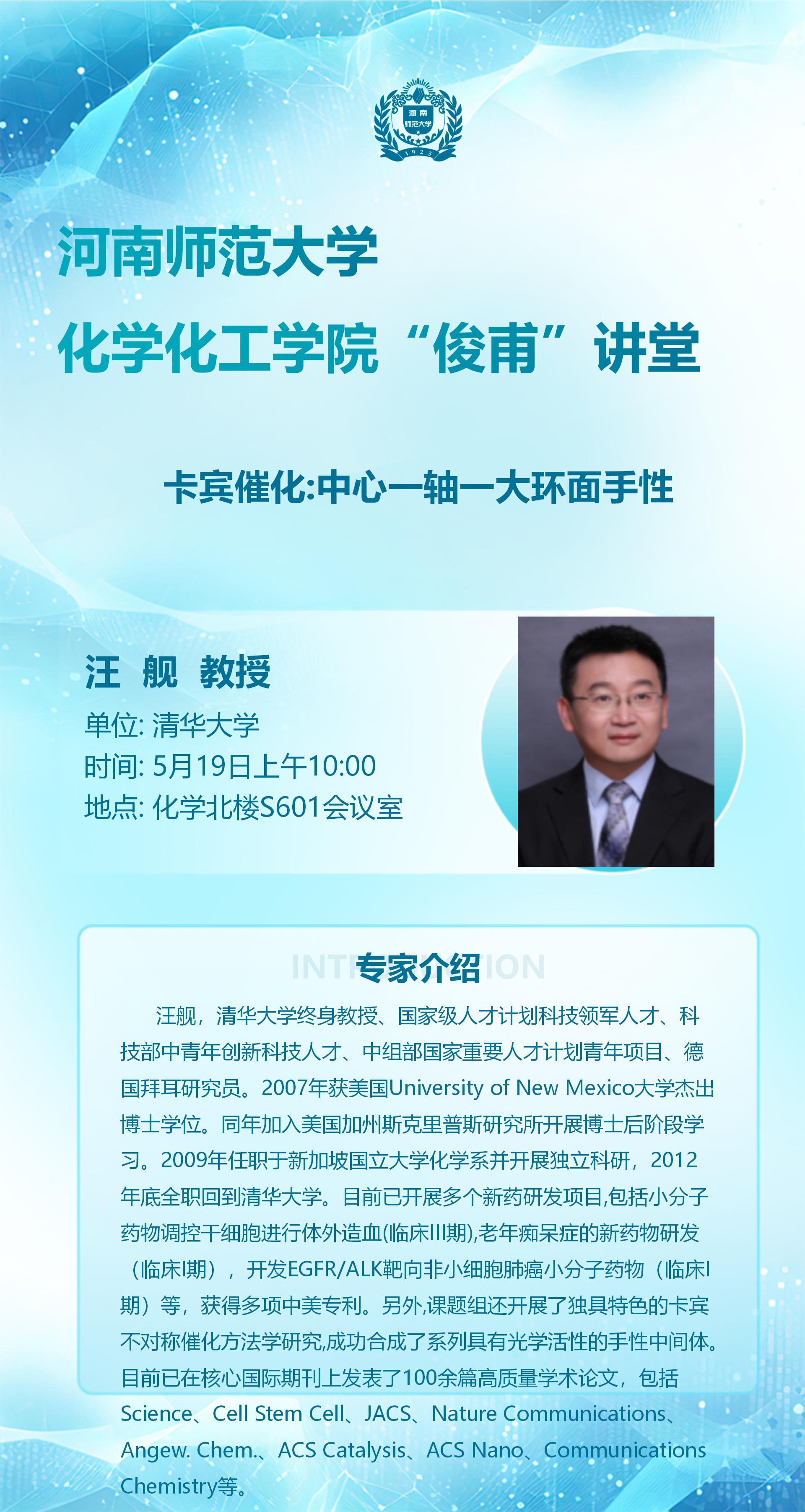 清华大学汪舰教授将应邀做客“俊甫讲堂”