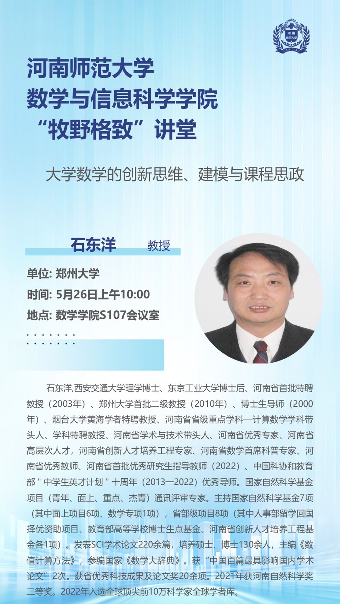 郑州大学石东洋教授将应邀做客“牧野格致”讲堂