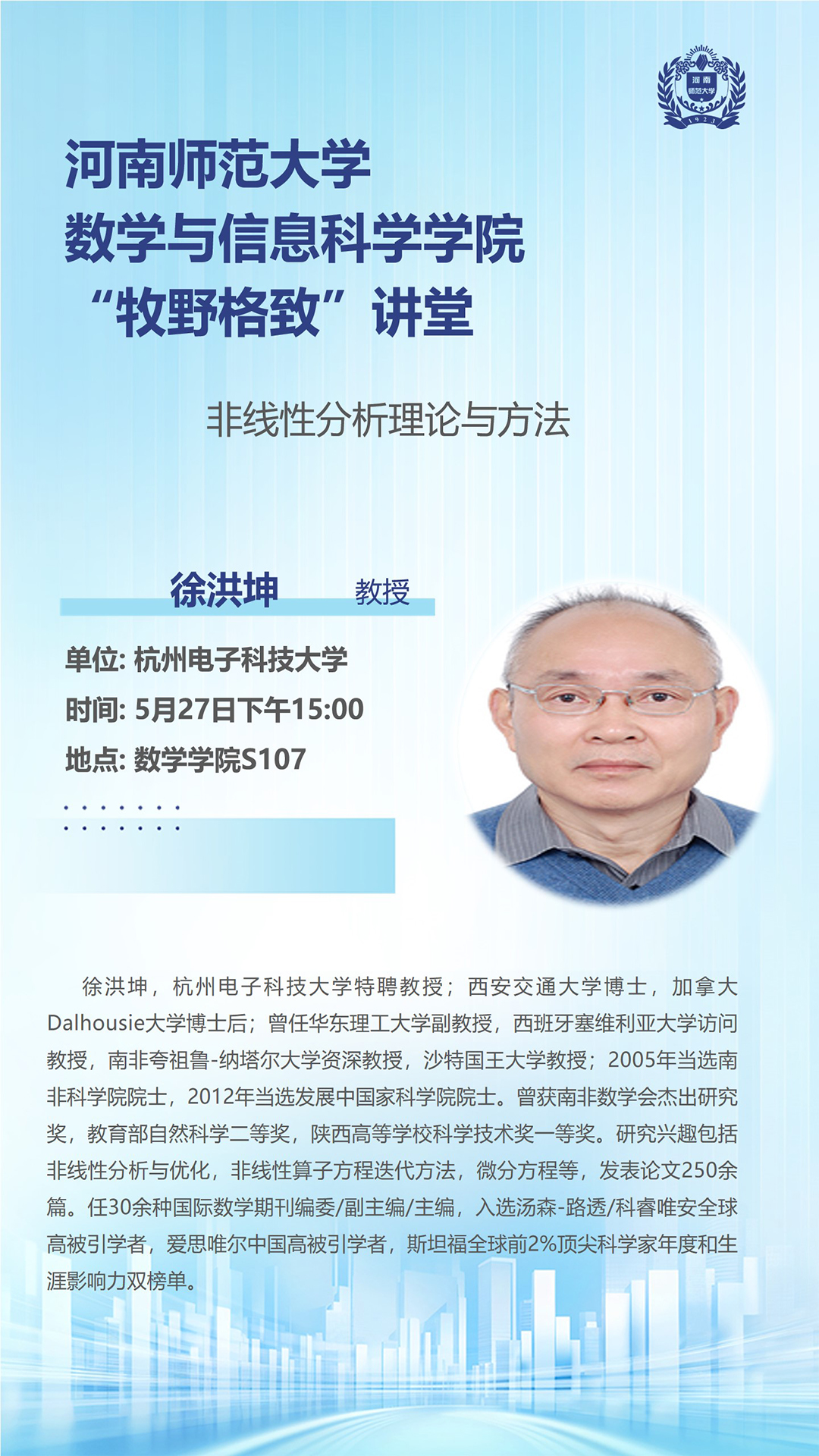 杭州电子科技大学特聘教授徐洪坤院士将应邀做客“牧野格致”讲堂