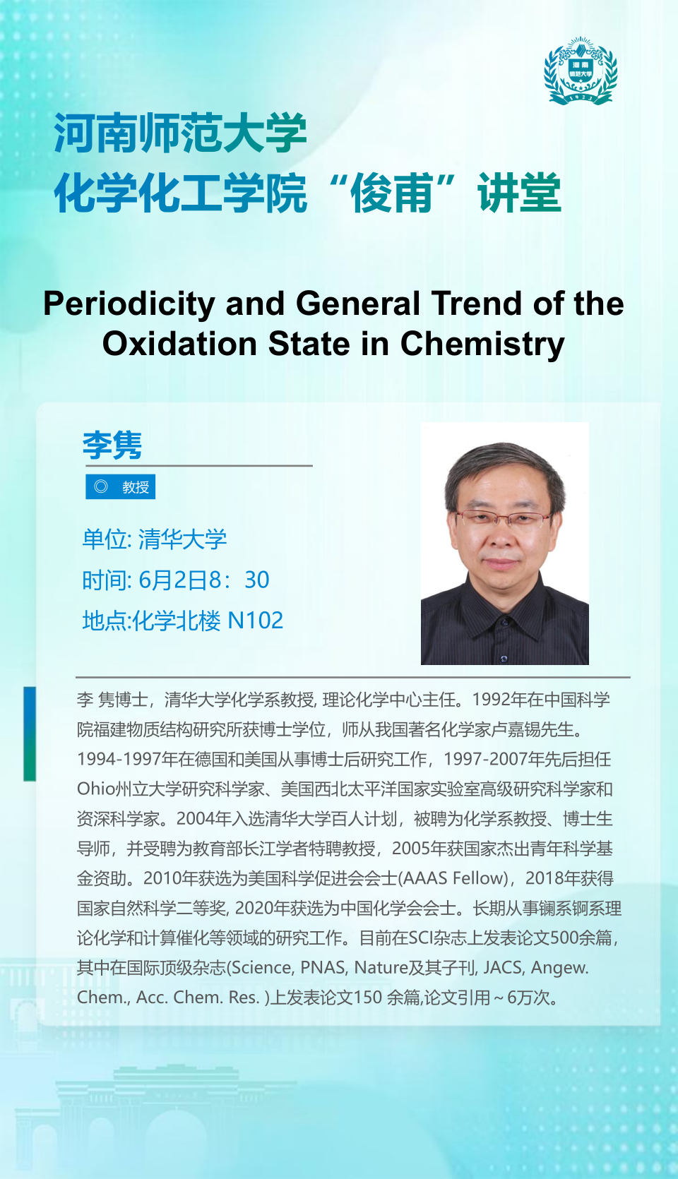 清华大学李隽教授将应邀做客“俊甫讲堂”
