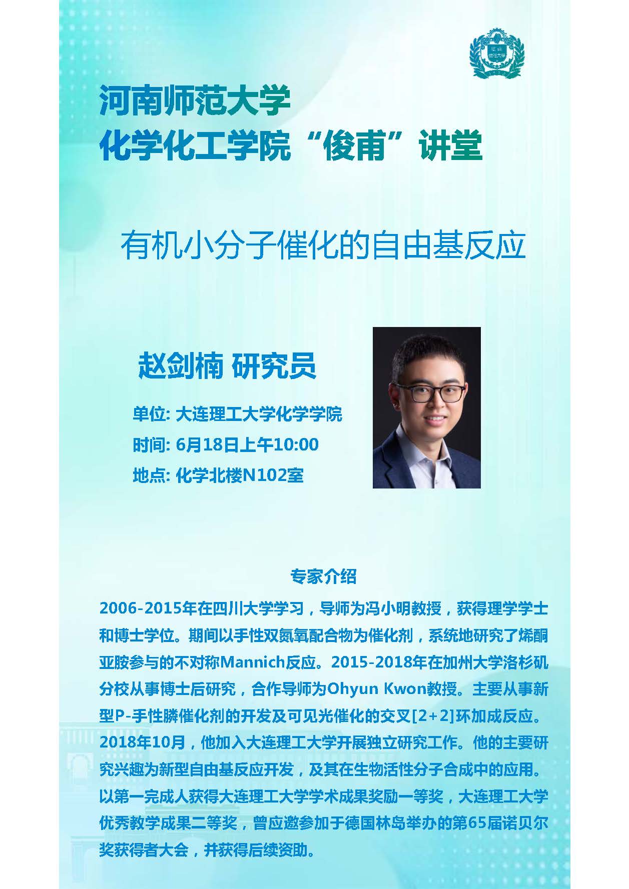 大连理工大学赵剑楠研究员将应邀做客“俊甫讲堂”
