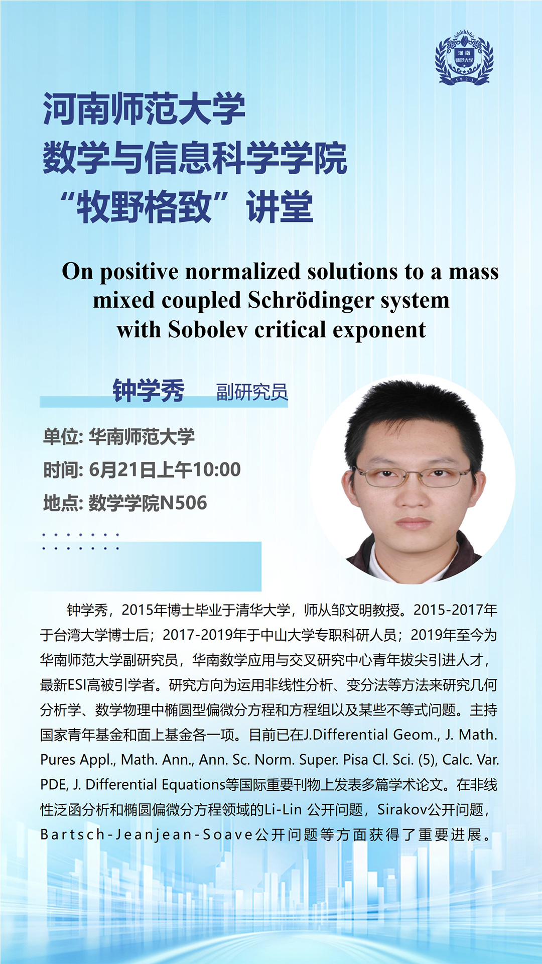 华南师范大学钟学秀副研究员将应邀做客“牧野格致”讲堂