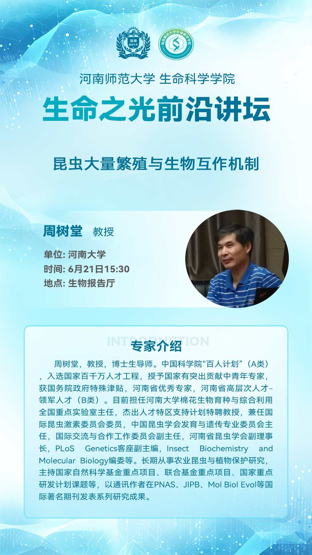 河南大学周树堂教授将应邀做客“生命之光前沿讲坛”