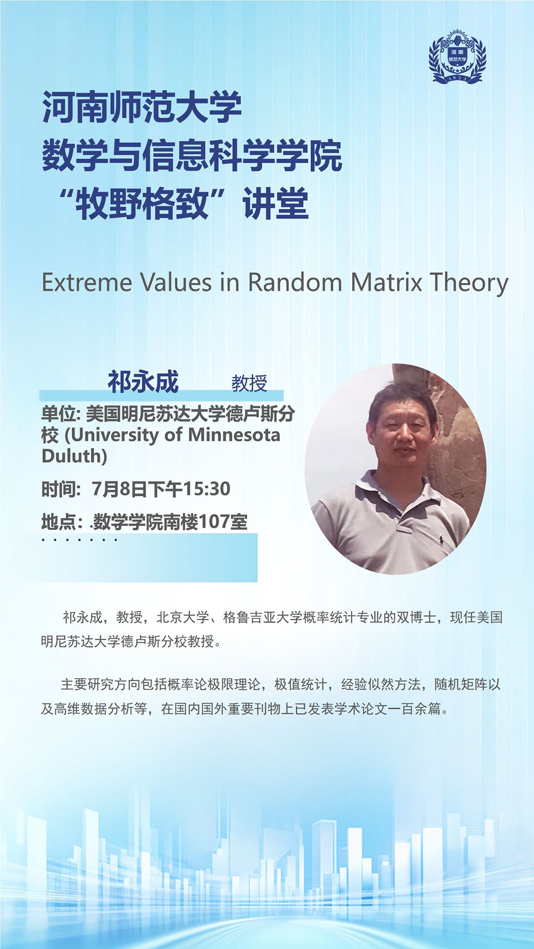 美国明尼苏达大学德卢斯分校祁永成教授将应邀做客“牧野格致”讲堂