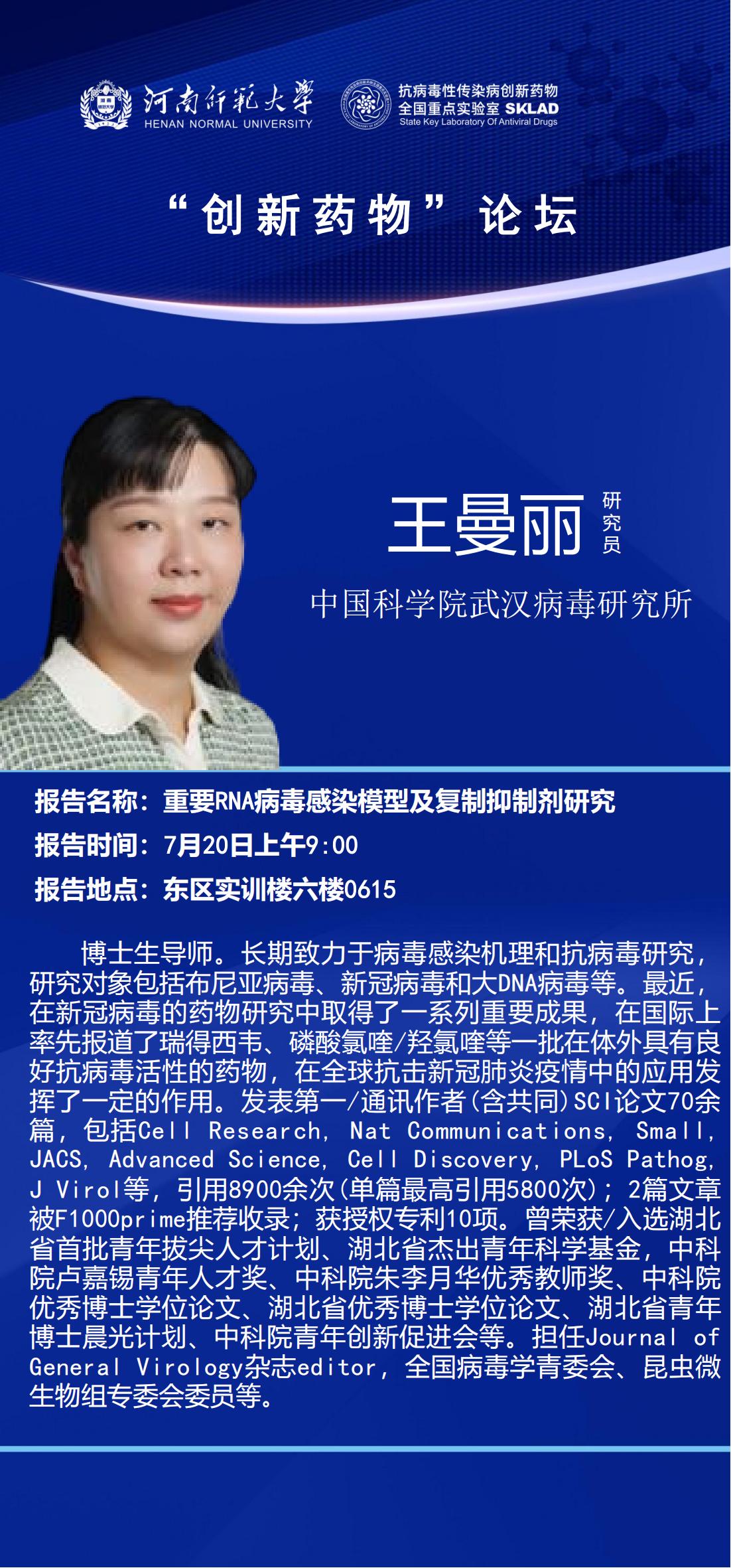 中国科学院武汉病毒研究所王曼丽研究员将应邀做客“创新药物”论坛