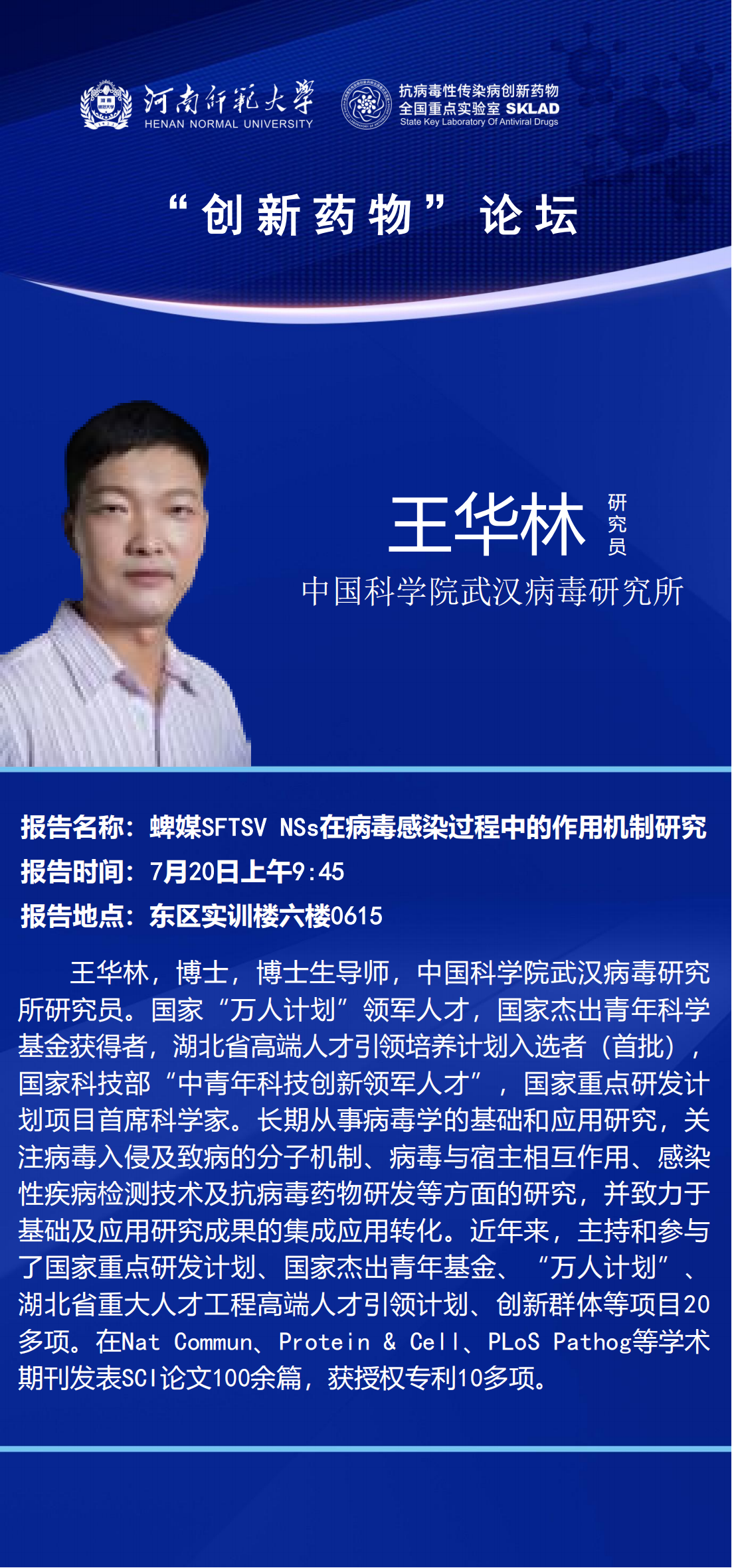 中国科学院武汉病毒研究所王华林研究员将应邀做客“创新药物”论坛