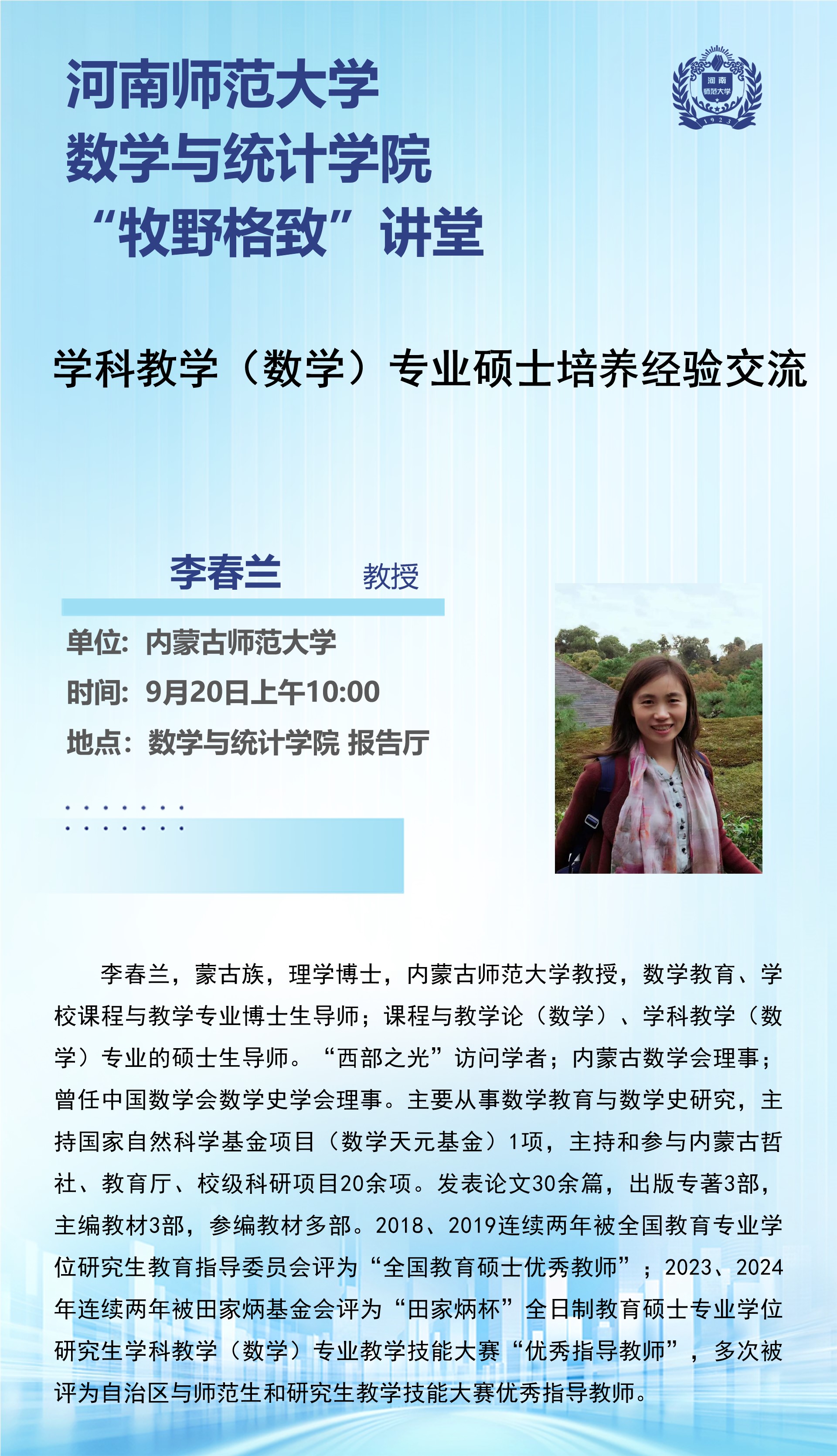 内蒙古师范大学李春兰教授将应邀做客“牧野格致”讲堂