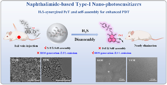 光动力疗法作为一种重要的肿瘤治疗手段,长期面临光敏剂的氧依赖性强、肿瘤靶向性差、持续的光活性(荧光信号以及光敏活性)等多类问题。研究团队针对上述问题,以传统萘酰亚胺为荧光团与光敏核心,整合光诱导电子转移(PeT)和纳米自组装,提出了一种激活型纳米光敏剂设计新策略,显著增强I型光化学反应。