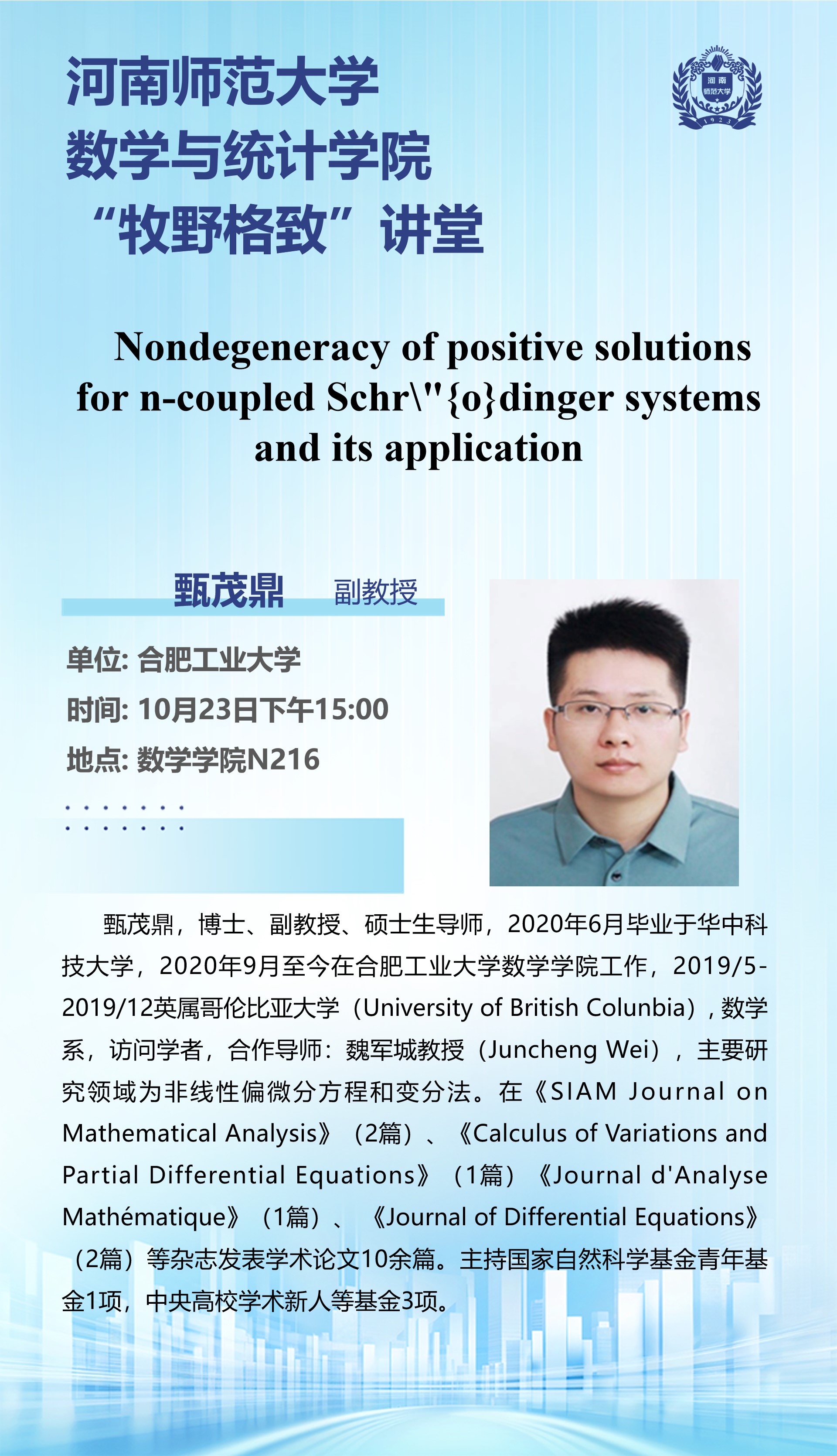 合肥工业大学甄茂鼎副教授将应邀做客“牧野格致”讲堂
