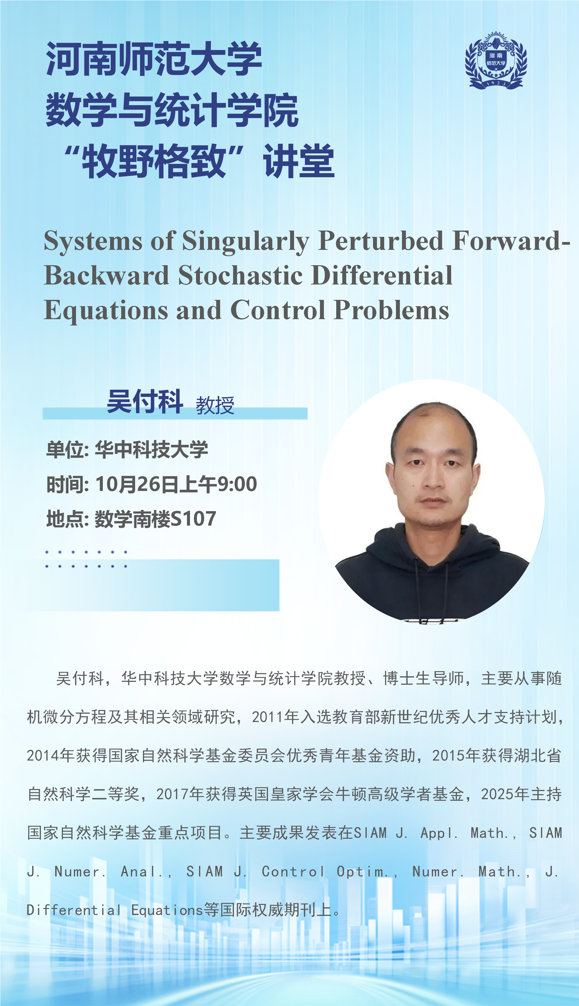 华中科技大学吴付科教授将应邀做客“牧野格致”讲堂