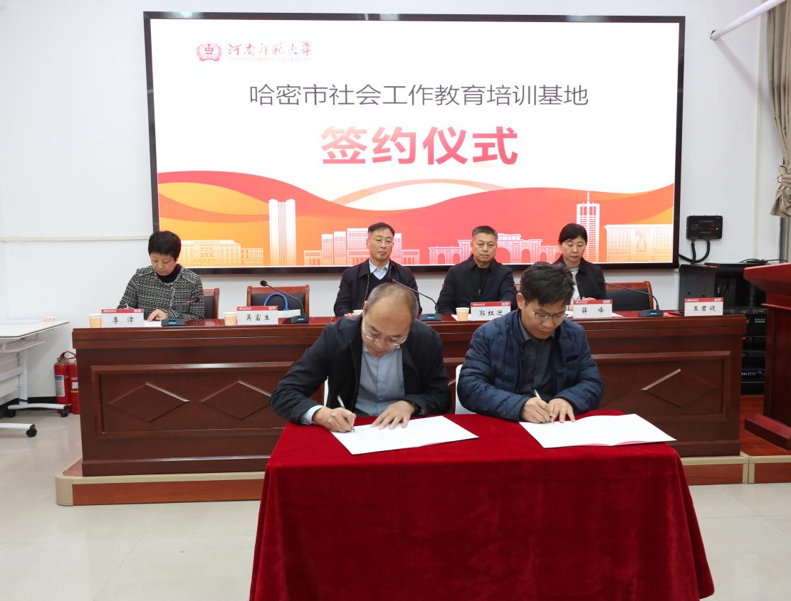 开班仪式上,吴富生与社会学院院长王君健共同签署战略合作协议,郭红迎与吴富生为“哈密市社会工作教育培训基地”揭牌,标志着校地合作迈入新阶段。