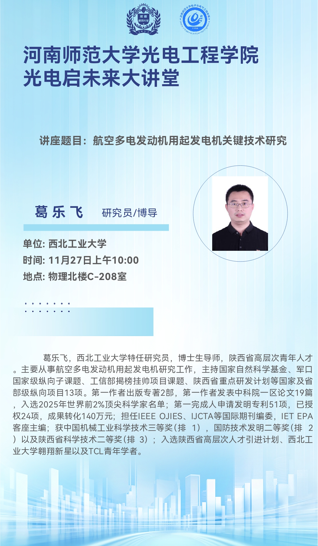 西北工业大学葛乐飞教授将应邀做客“光电启未来大讲堂”