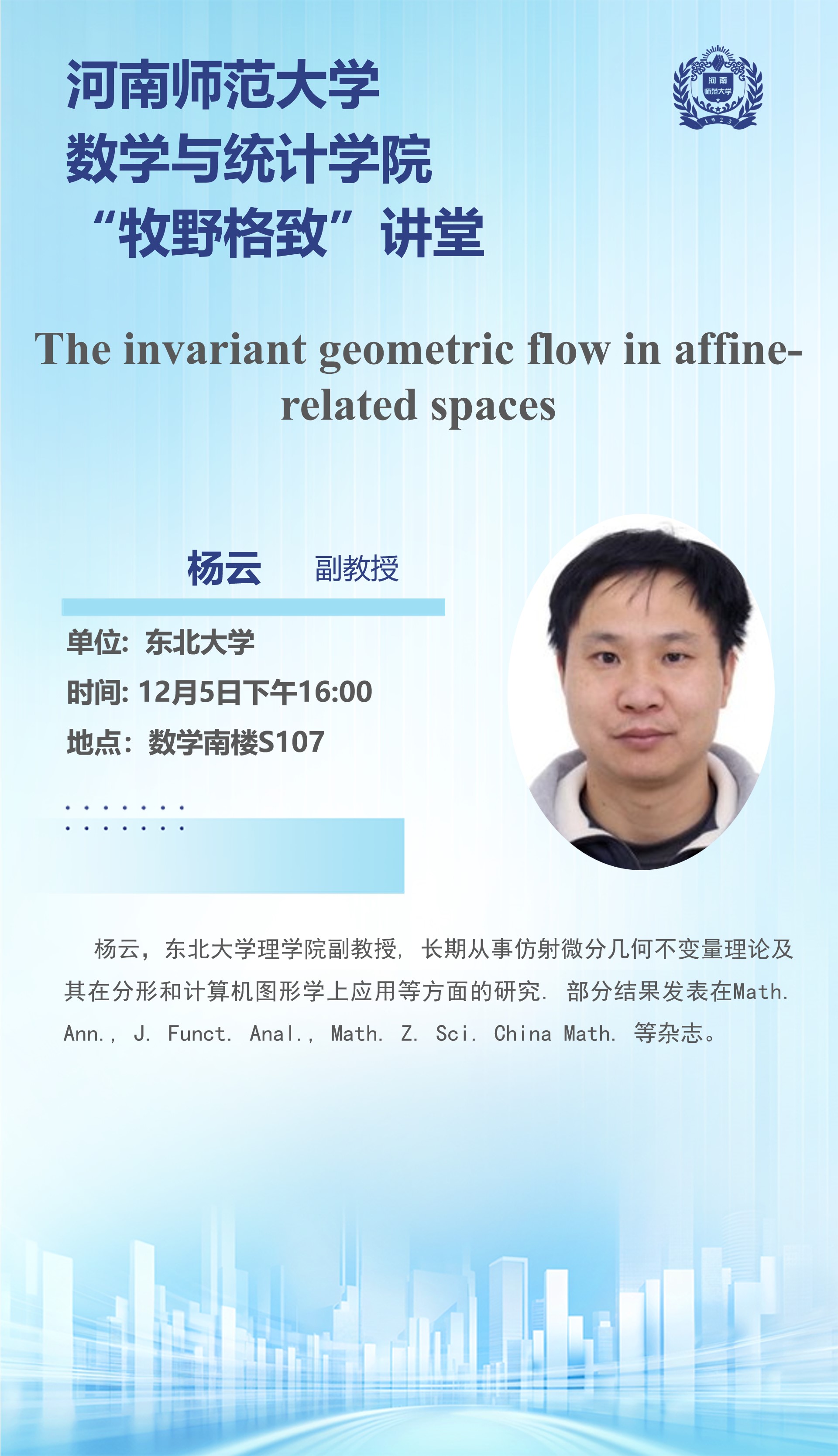 东北大学杨云副教授将应邀做客“牧野格致”讲堂