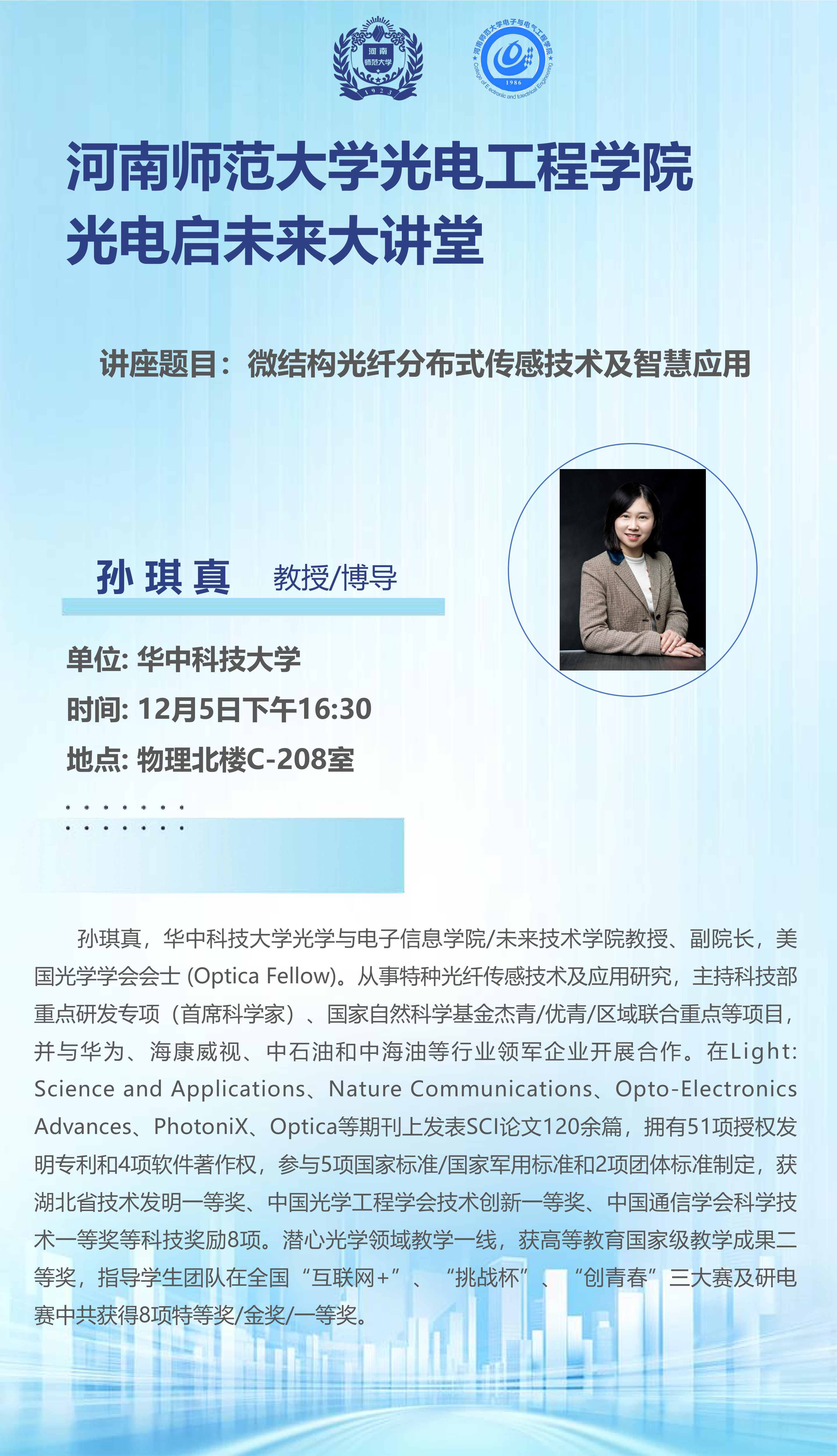 华中科技大学孙琪真教授将应邀做客“光电启未来”大讲堂