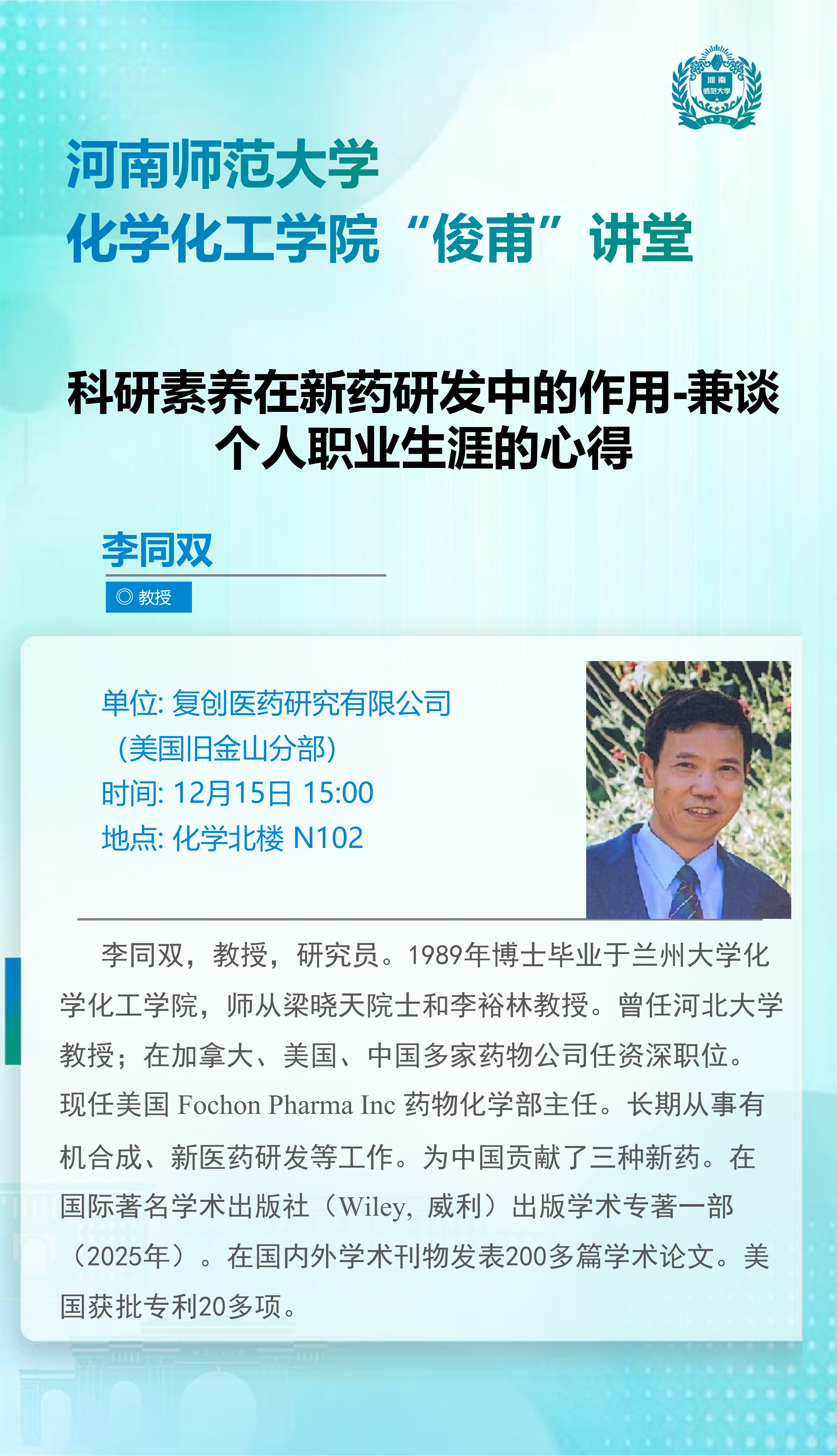 复创医药研究有限公司(美国旧金山分部)李同双研究员将应邀做客“俊甫讲堂”