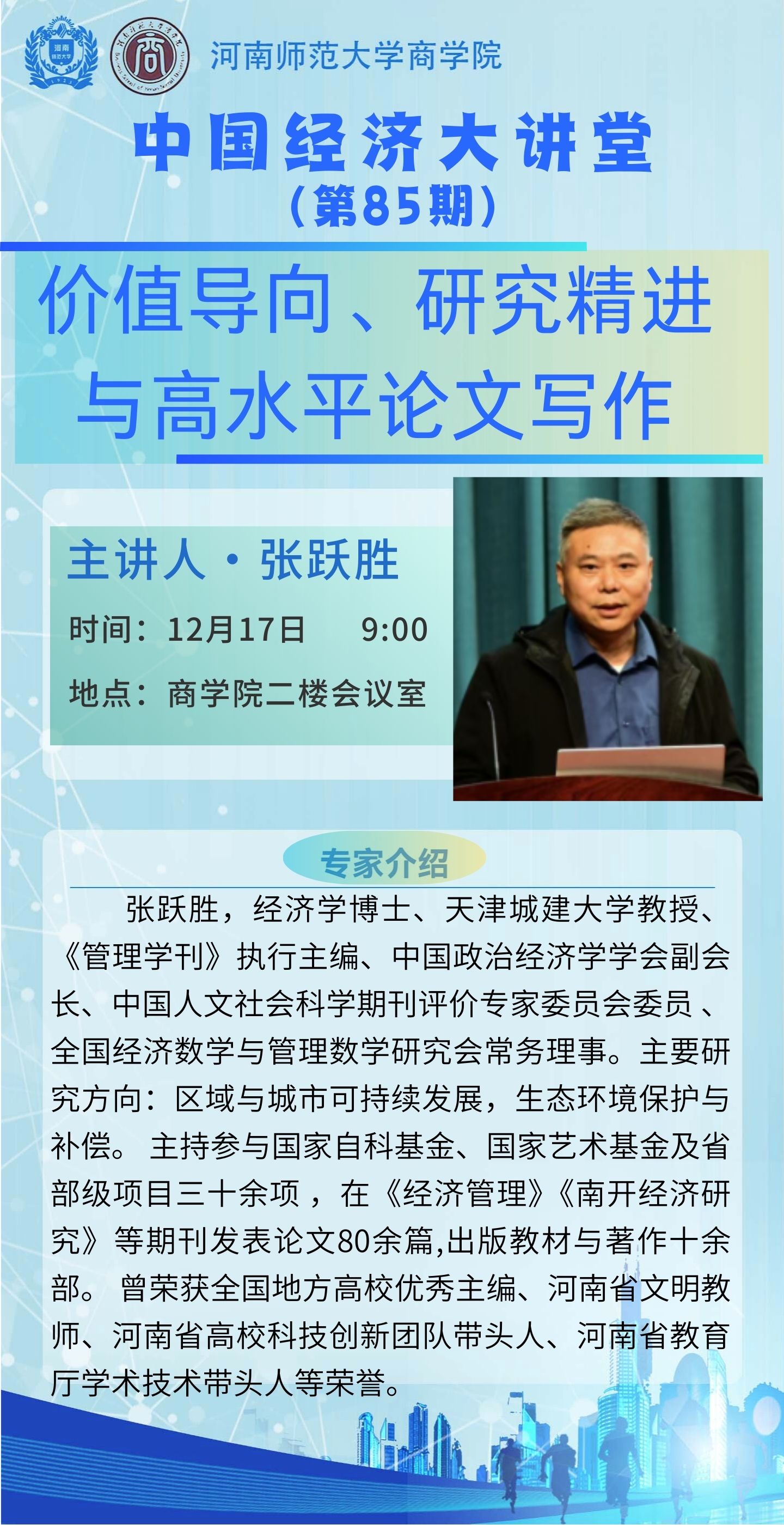 天津城建大学张跃胜教授将应邀做客“中国经济大讲堂”