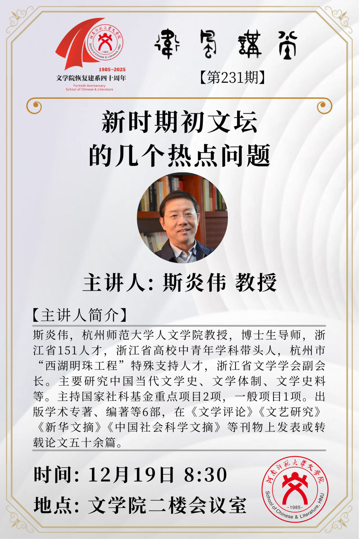 杭州师范大学斯炎伟教授将应邀做客“卫风讲堂”
