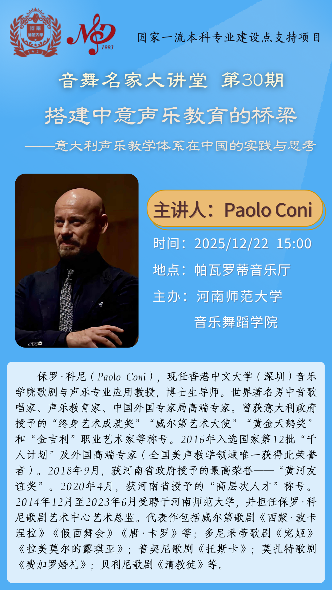 著名男中音歌唱家、香港中文大学保罗·科尼教授将应邀做客“音舞名家大讲堂”