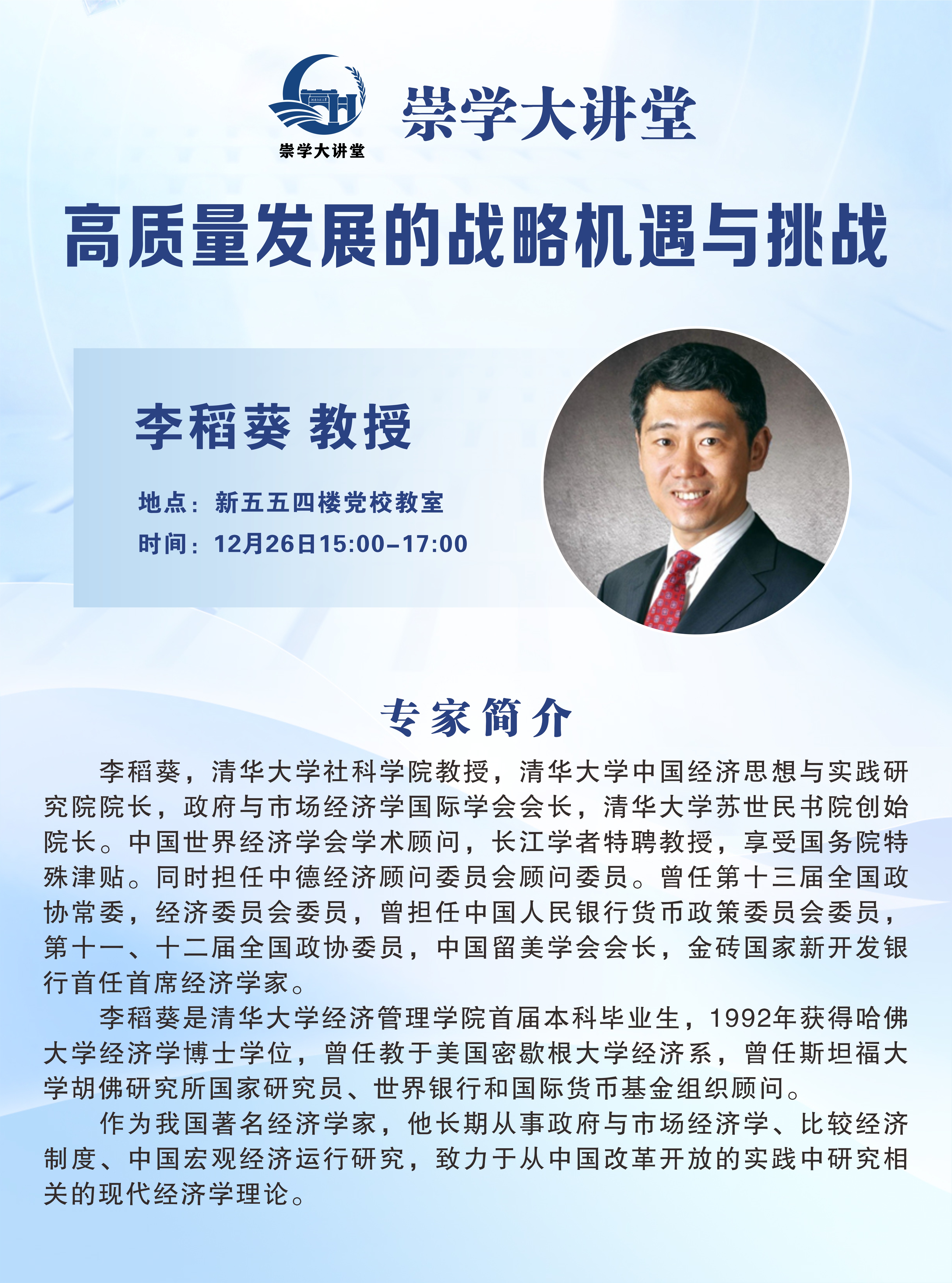 清华大学李稻葵教授将应邀做客“崇学大讲堂”