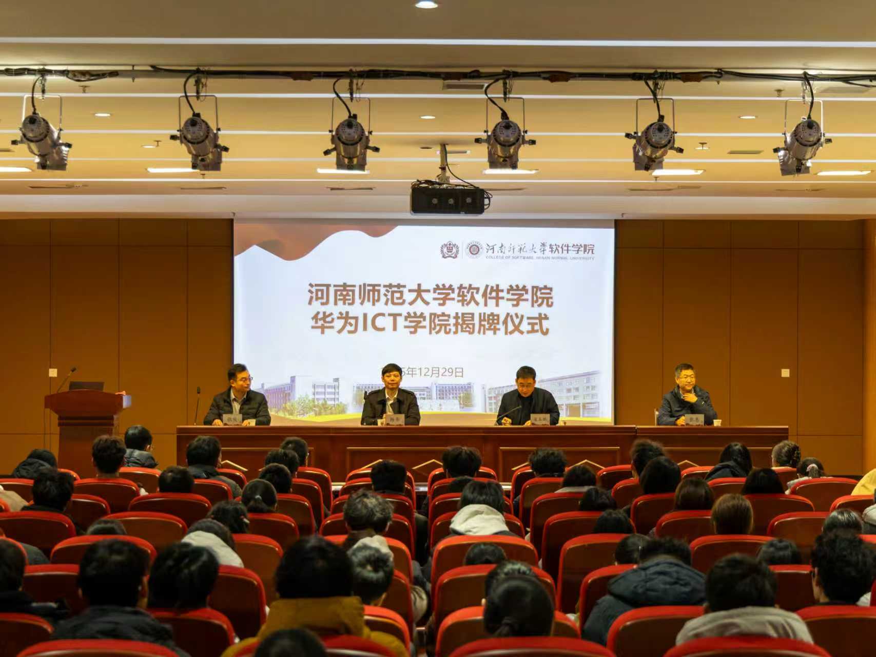 12月29日上午,软件学院华为ICT学院揭牌仪式在平原湖校区第二报告厅举行。华为有限公司河南代表处教育业务部部长杨华、教学主管侯达,深圳市讯方技术股份有限公司河南省总经理张俊,软件学院相关负责人、师生代表200多人参加。仪式由院党委书记寇玉鹏主持。