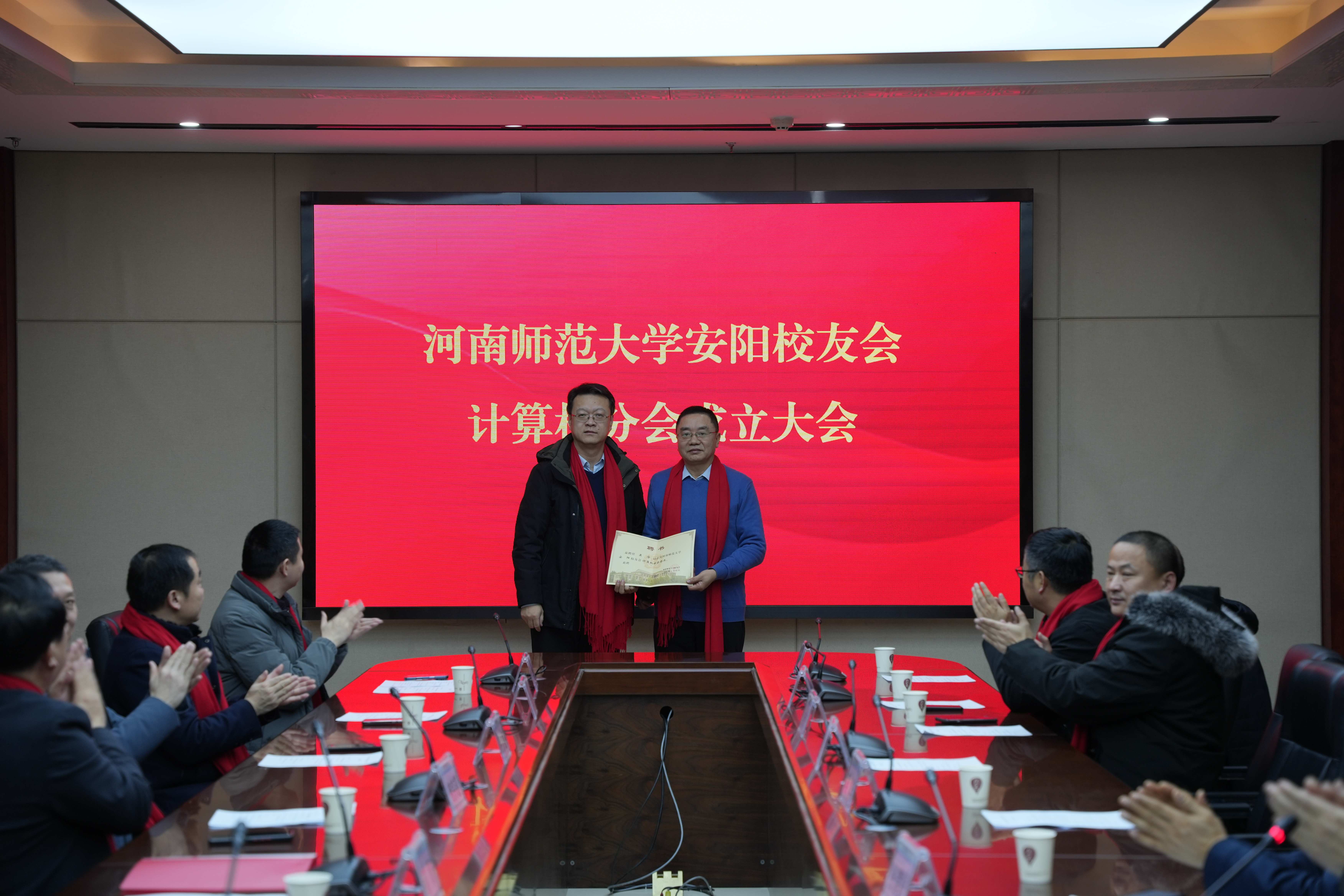 校友与基金工作办公室主任崔宗超宣读了《关于同意成立河南师范大学安阳校友会计算机学院分会的决定》。安阳校友会计算机学院分会筹备组负责人向大会汇报了分会筹备工作情况,与会校友表决通过了首届理事会名单。苗雨为新当选的理事会成员颁发聘书。