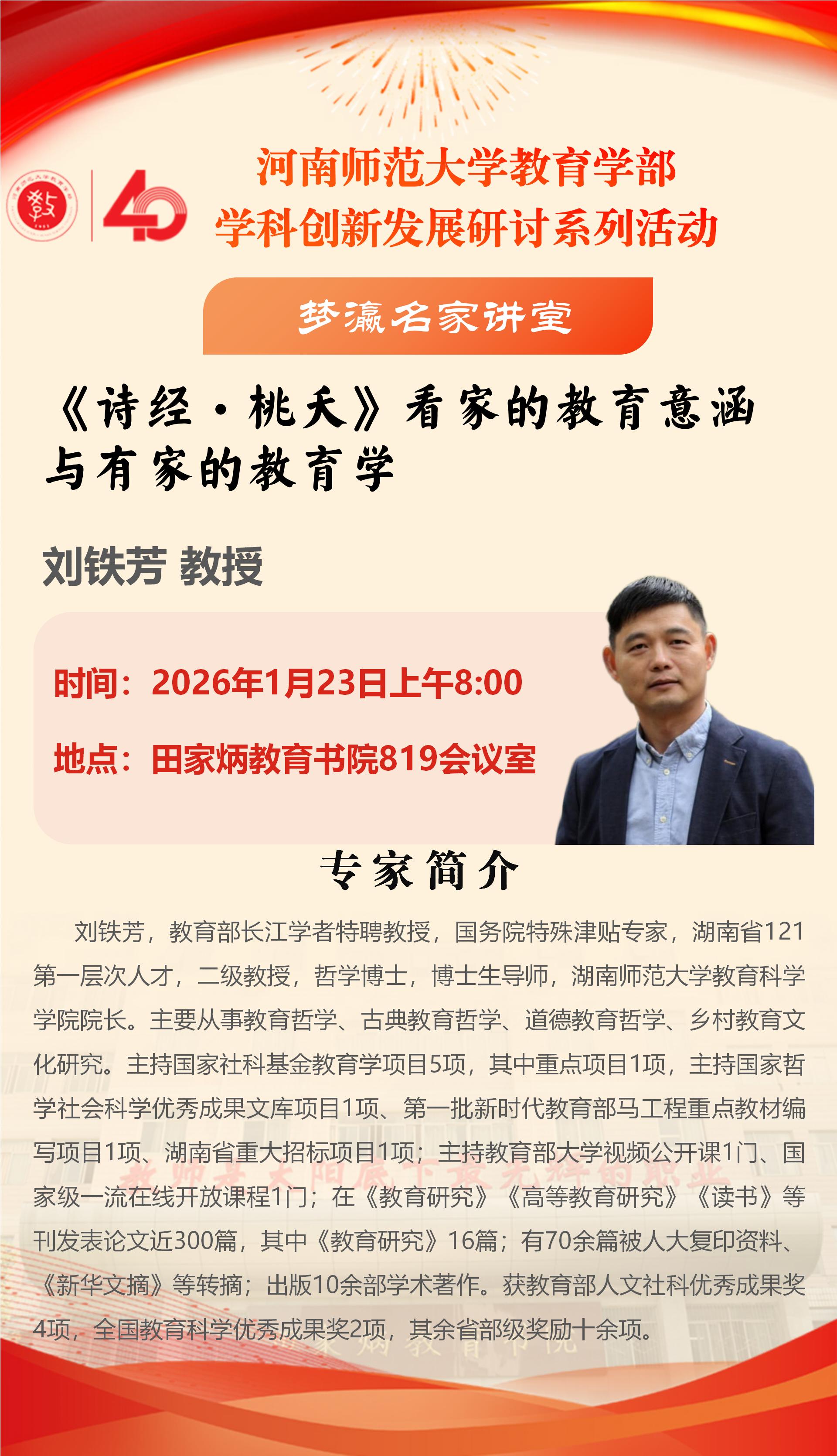 湖南师范大学刘铁芳教授将应邀做客“梦瀛名家讲堂”
