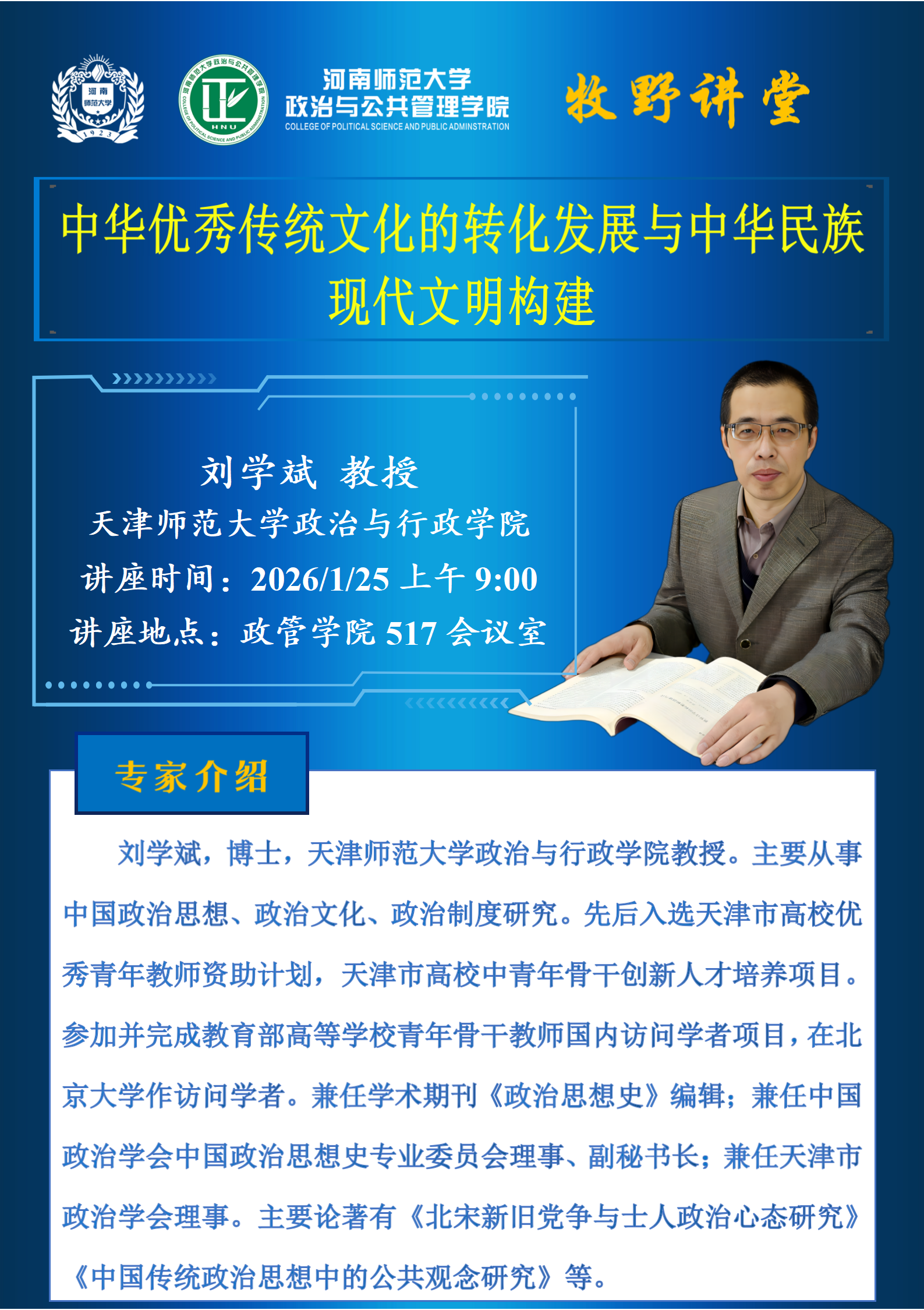 天津师范大学刘学斌教授将应邀做客“牧野讲堂”