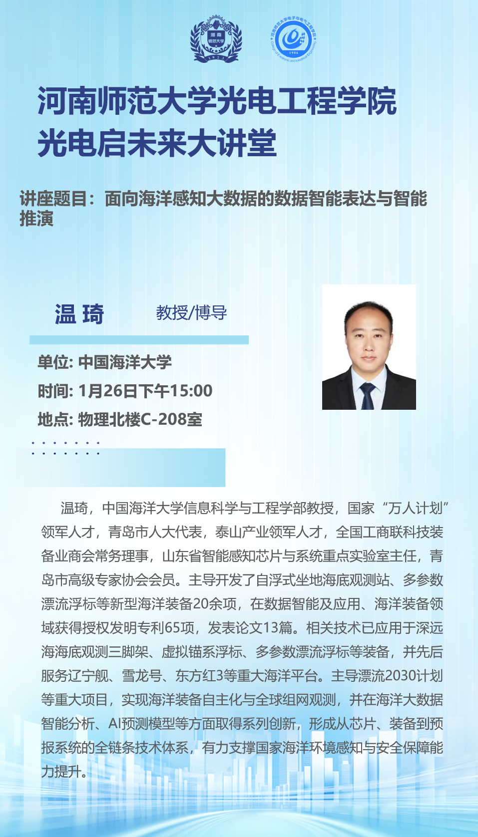 中国海洋大学温琦教授将应邀做客“光电启未来”大讲堂