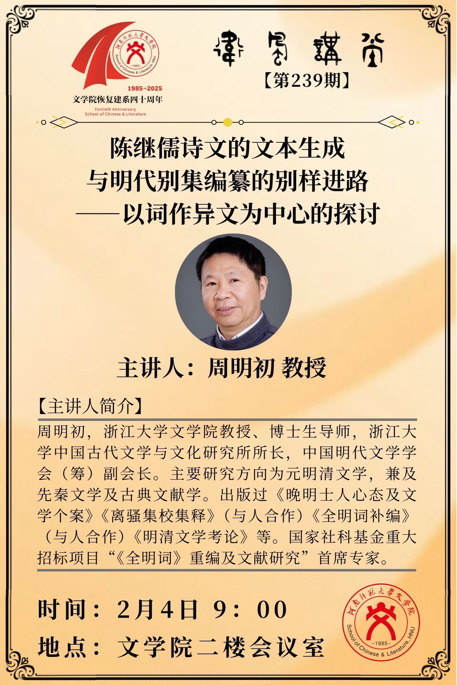 浙江大学周明初教授将应邀做客文学院“卫风讲堂”