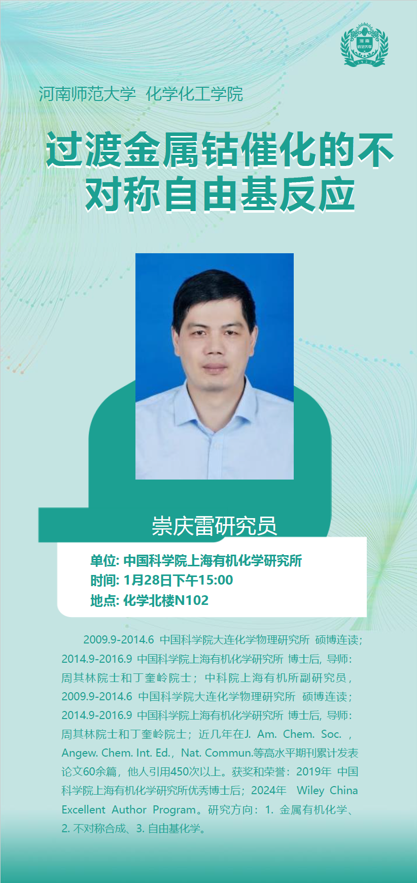 中国科学院上海有机化学研究所崇庆雷研究员将应邀做客“俊甫讲堂”