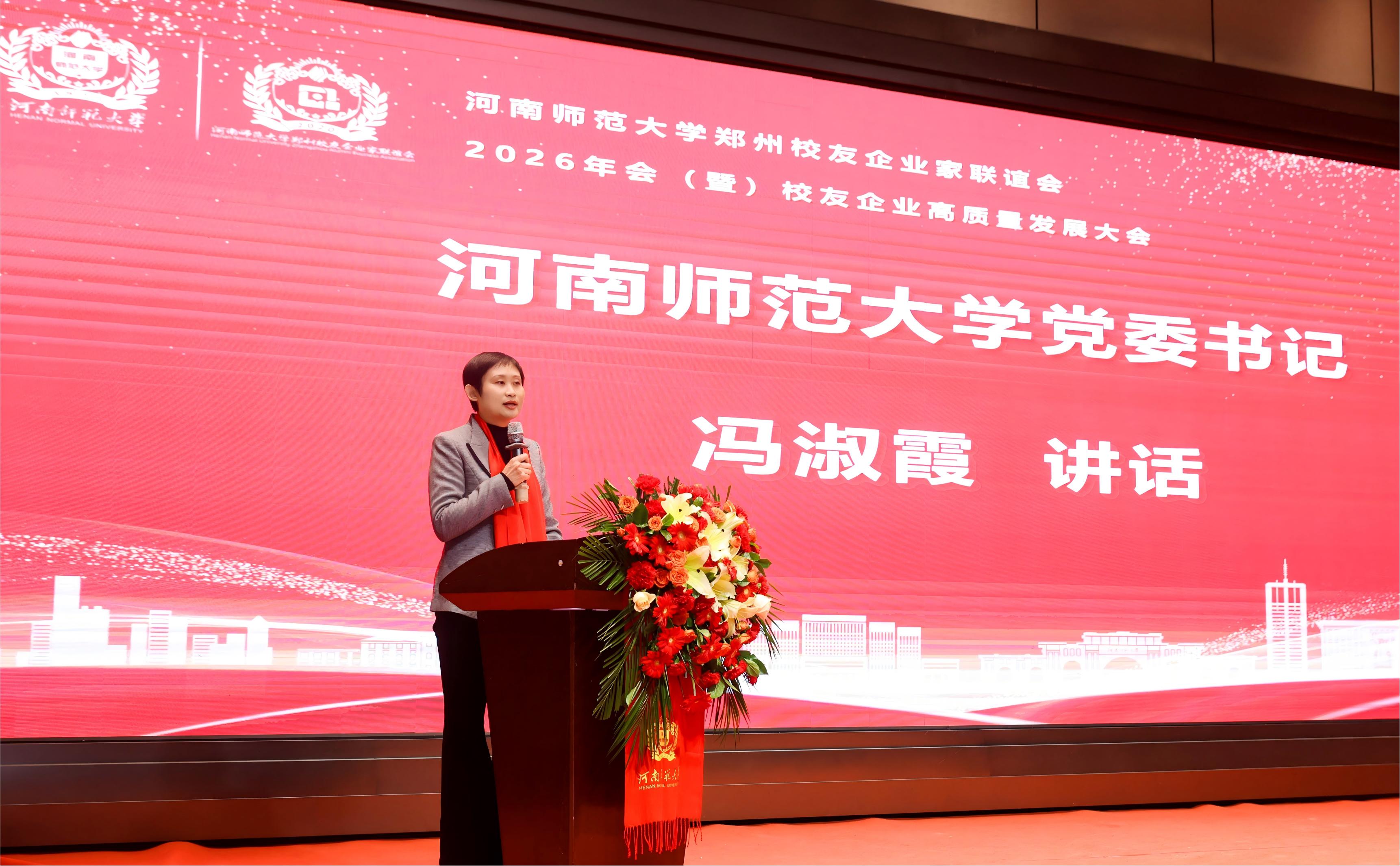 冯淑霞对郑州校友企业家联谊会的工作表示肯定,向长期以来关心支持母校建设与发展的校友企业家们致以新春的问候和衷心的感谢,并介绍了过去一年学校在学科建设、科研创新、人才培养、师资队伍、办学资源、社会服务等方面取得的优异成绩。她指出,师大积极发挥学科与人才优势,为企业提供人才培训、政策咨询等社会服务,深度融入并助力河南产业高质量发展。未来,学校将搭建学术资源共享平台、完善校企合作对接平台、升级校友互助交流平台,与郑州校友企业家携手深化合作,共同推进校地产业协同发展,为区域创新与产业升级注入持久动力。希望郑州校友企业家联谊会始终秉持“服务校友、服务母校、服务社会”的宗旨,当好情感联络员、资源连接器和母校代言人,以实干笃行助力母校“双一流”创建,以担当作为助推郑州高质量发展,为奋力谱写中原大地推进中国式现代化新篇章做出新的更大贡献。