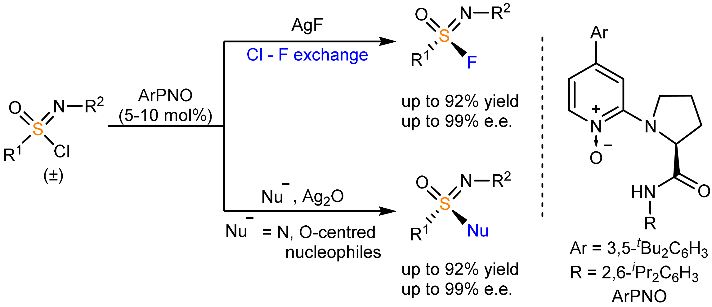 硫氟交换反应应用广泛,受亚砜亚胺基团三维空间环境拥挤影响,手性亚砜亚胺基团转移仍极具挑战。该研究以自主研发的手性4-芳基吡啶氮氧为催化剂,以外消旋的氯代亚砜亚胺为反应物,成功实现了催化不对称亚砜亚胺基团转移反应,构建了光学活性的氟代亚砜亚胺及其衍生物。实验与理论计算研究表明,该反应属于动态动力学不对称转化,两分子催化剂结合的五配位硫中间体是实现硫构型原位消旋化的关键。研究所得光学活性氟代亚砜亚胺可作为通用的三维硫氟交换反应连接臂,与多种亲核试剂发生立体特异性连接反应,为光学活性硫(VI)功能分子的高效构建提供模块化平台。这项工作为解决手性硫(VI)化合物合成难题提供了新思路,为手性亲核催化剂和不对称亚砜亚胺基转移反应的发展开辟了新方向。研究成果有望在药物化学和点击化学等领域发挥关键作用。