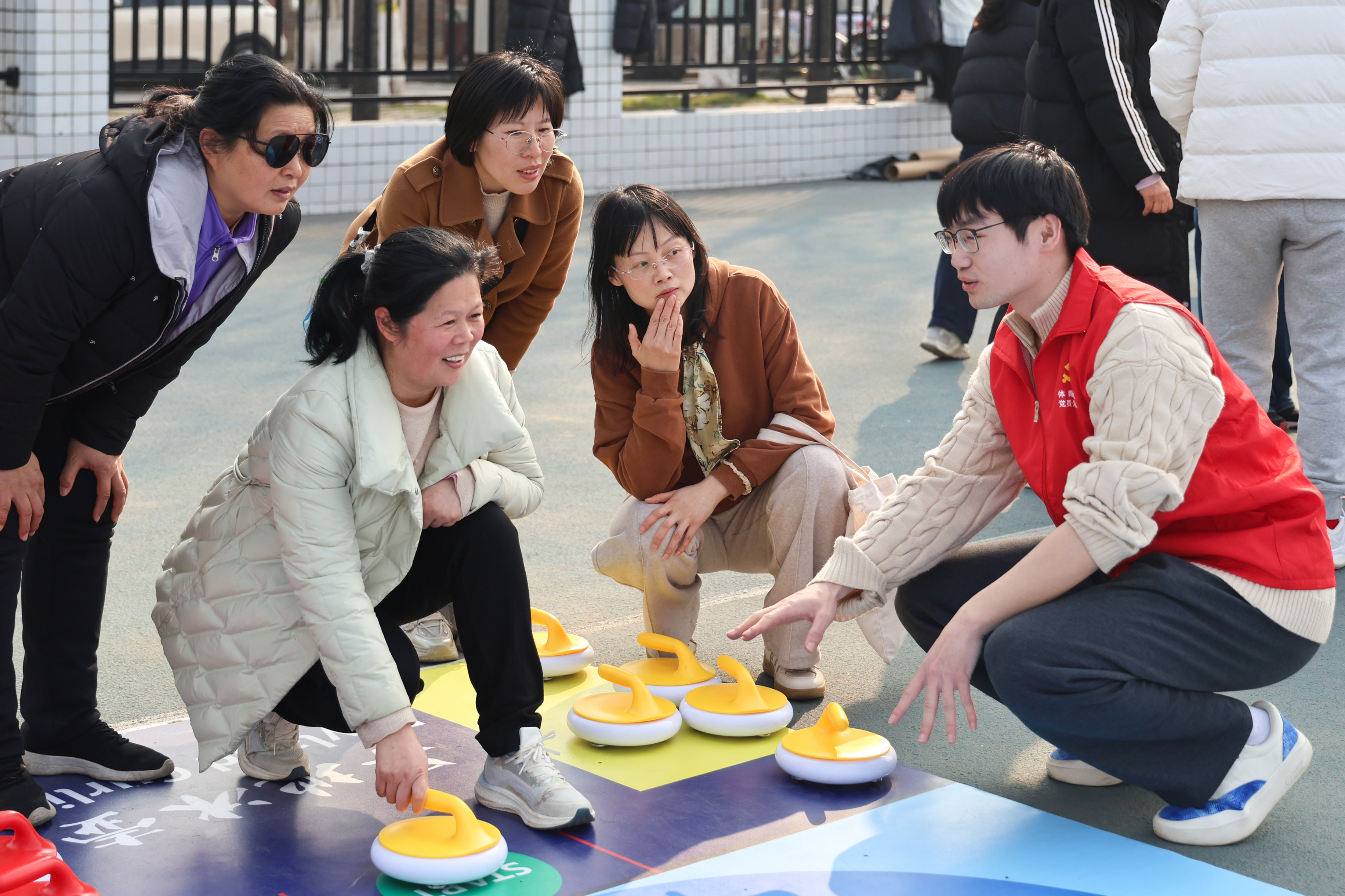活动现场组织热身操展演,多首曲目搭配不同风格的健身动作,帮助女教职工舒展身体、调整状态,为后续活动开展做好准备。运动会设置“一马当先”毛毛虫竞速、“马不停蹄”蒙眼踏步、“快马加鞭”夹球折返跑等趣味项目,并开设旱地冰壶体验区。各项活动兼具趣味性与协作性,女教职工们踊跃参与、默契配合,在轻松愉悦的氛围中增进交流、凝聚力量,展现了我校女教职工昂扬向上、团结奋进的精神风貌。