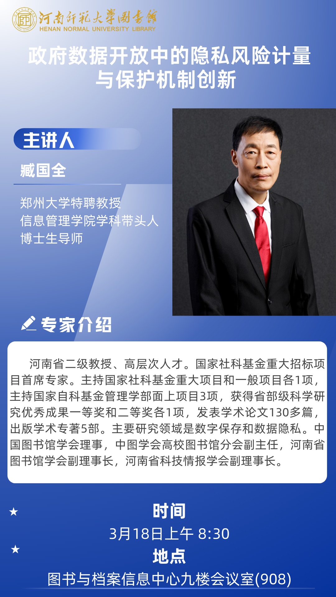 郑州大学臧国全教授将应邀做客图书与档案信息中心