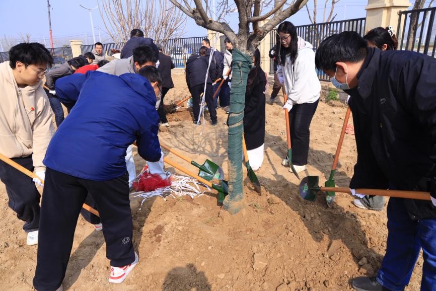 活动现场,师生党员热情高涨、干劲十足。在工作人员的指导下,大家分工协作,挥锹铲土、扶苗正干、培土浇灌,每个环节都认真细致、配合默契。经过共同努力,一棵棵新栽的树苗在春风中昂然挺立,为初春校园增添了勃勃生机。院党委委员、环境工程系皮运清教授说道:“以植树这种接地气的方式开展主题党日活动,既美化了新校区,也让我们在劳动中强化了生态保护意识,更坚定了以专业服务生态文明建设的责任与使命。”2023级本科生裴浩然表示:“亲手栽下的不仅是树苗,更是我们对绿色校园的期盼。我们要把绿色理念记在心中、落在行动,努力成长为堪当生态保护重任的时代新人。”