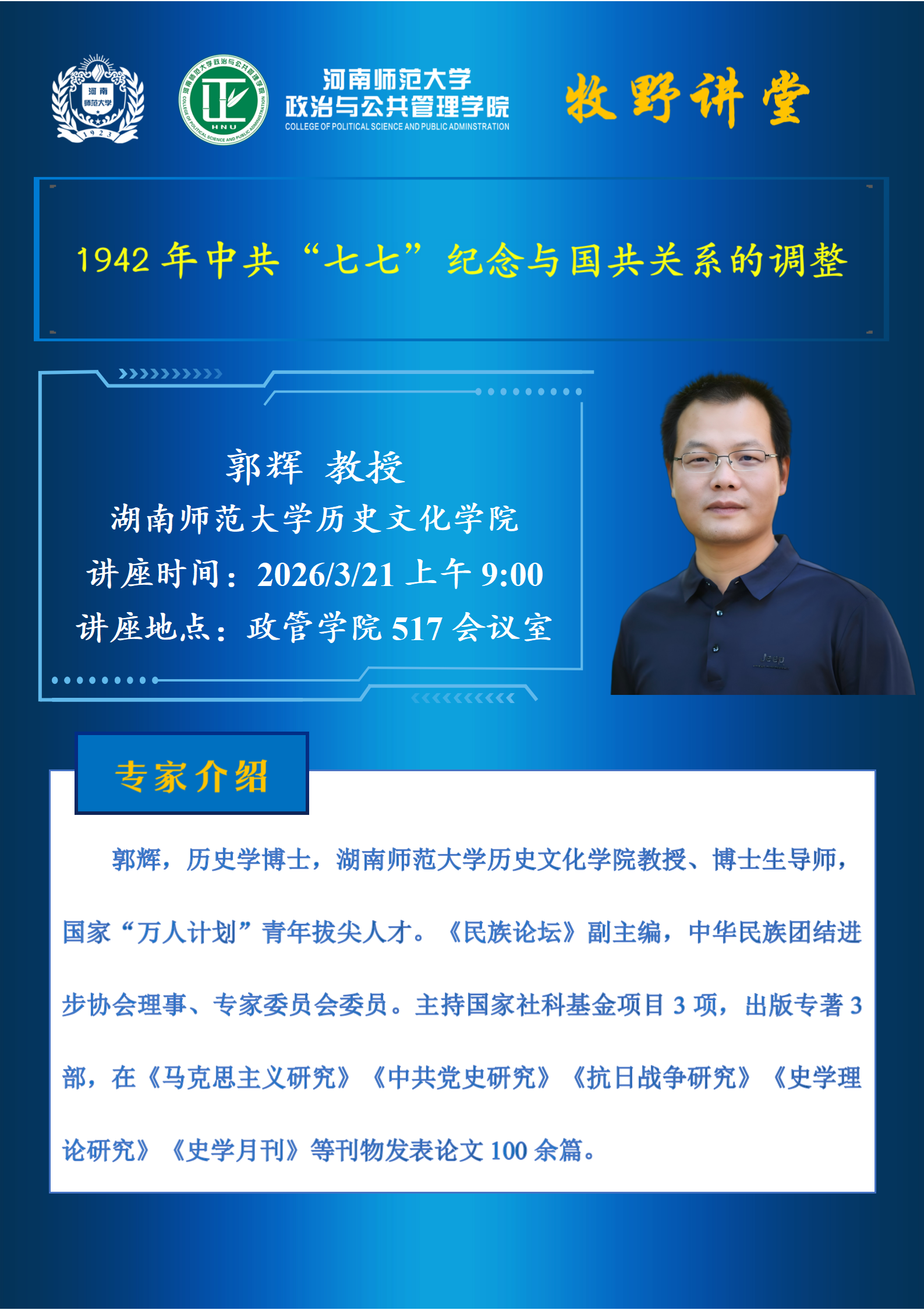 湖南师范大学郭辉教授将应邀做客“牧野讲堂”