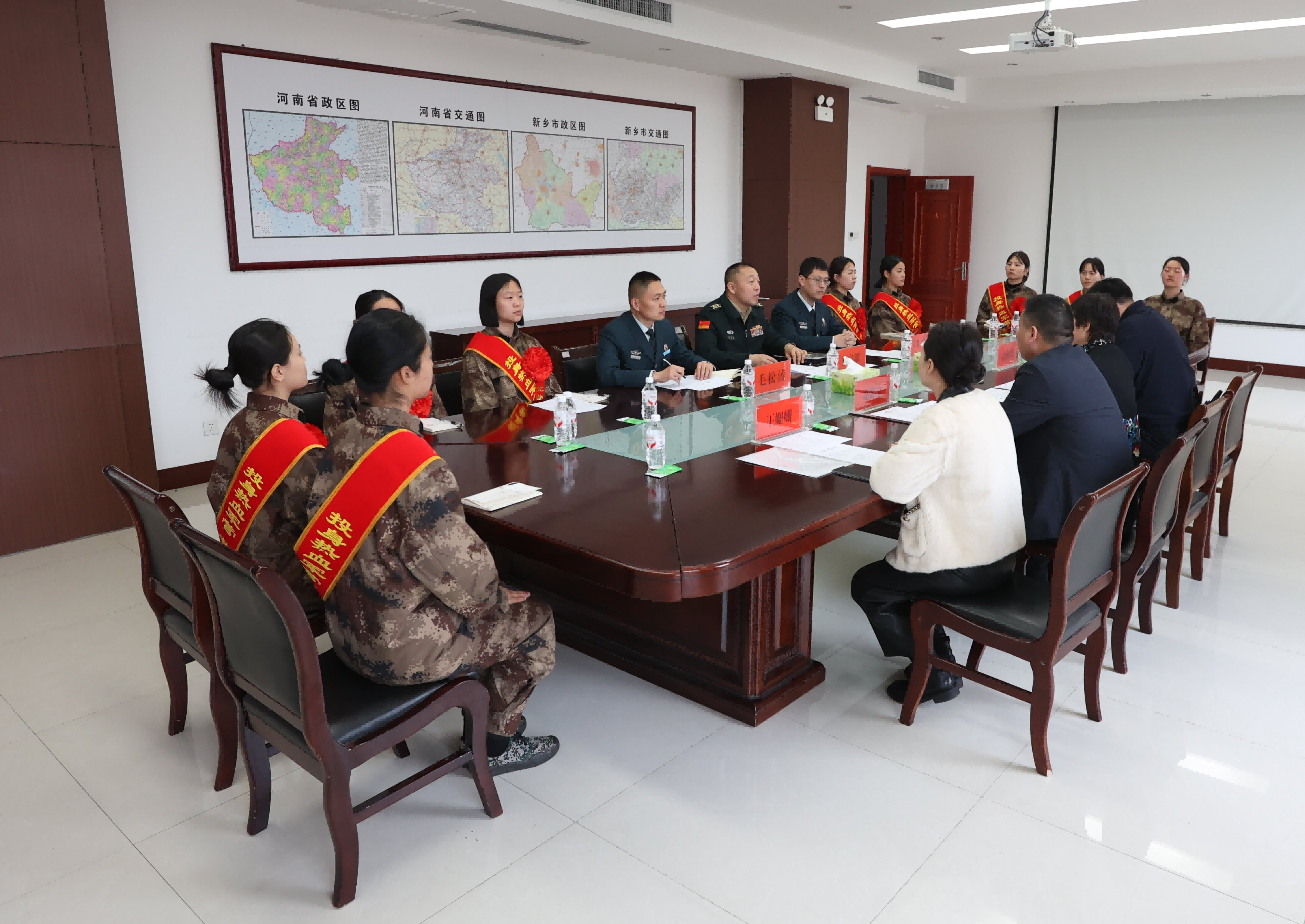 在新乡军分区,宋晔一行与王金龙、温伟、王双滨进行交流。军分区首长对我校国防教育和征兵工作给予肯定,期待军地双方深化合作,引导更多优秀学子为国防和军队现代化建设贡献青春力量。王宝贵和郝冉在欢送会上寄语新兵,要珍惜身穿戎装的宝贵机会,用实际行动践行强军誓言,为国防事业贡献青春力量。