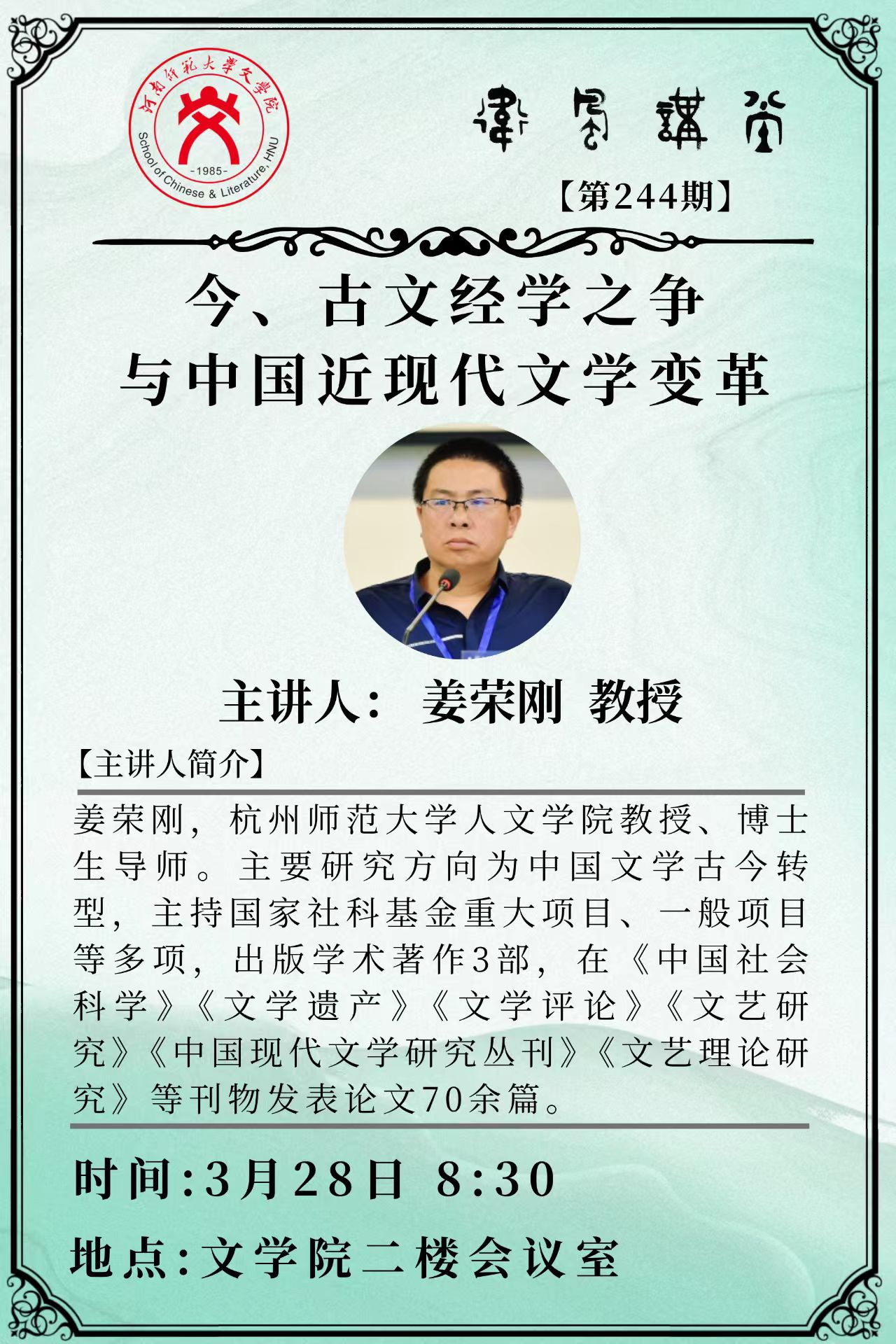 杭州师范大学姜荣刚教授将应邀做客“卫风讲坛”