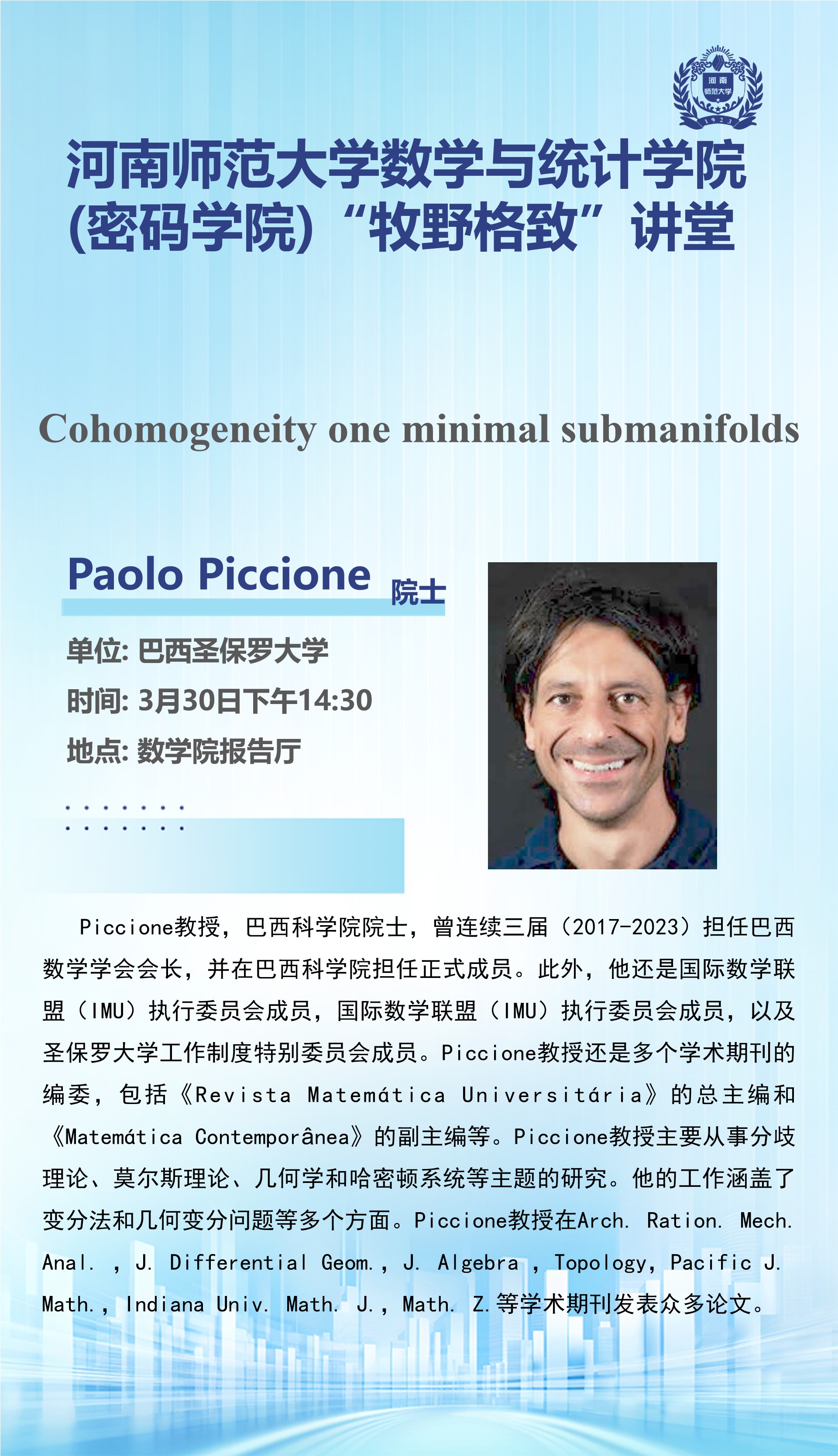 巴西圣保罗大学Paolo Piccione院士将应邀做客“牧野格致”讲堂