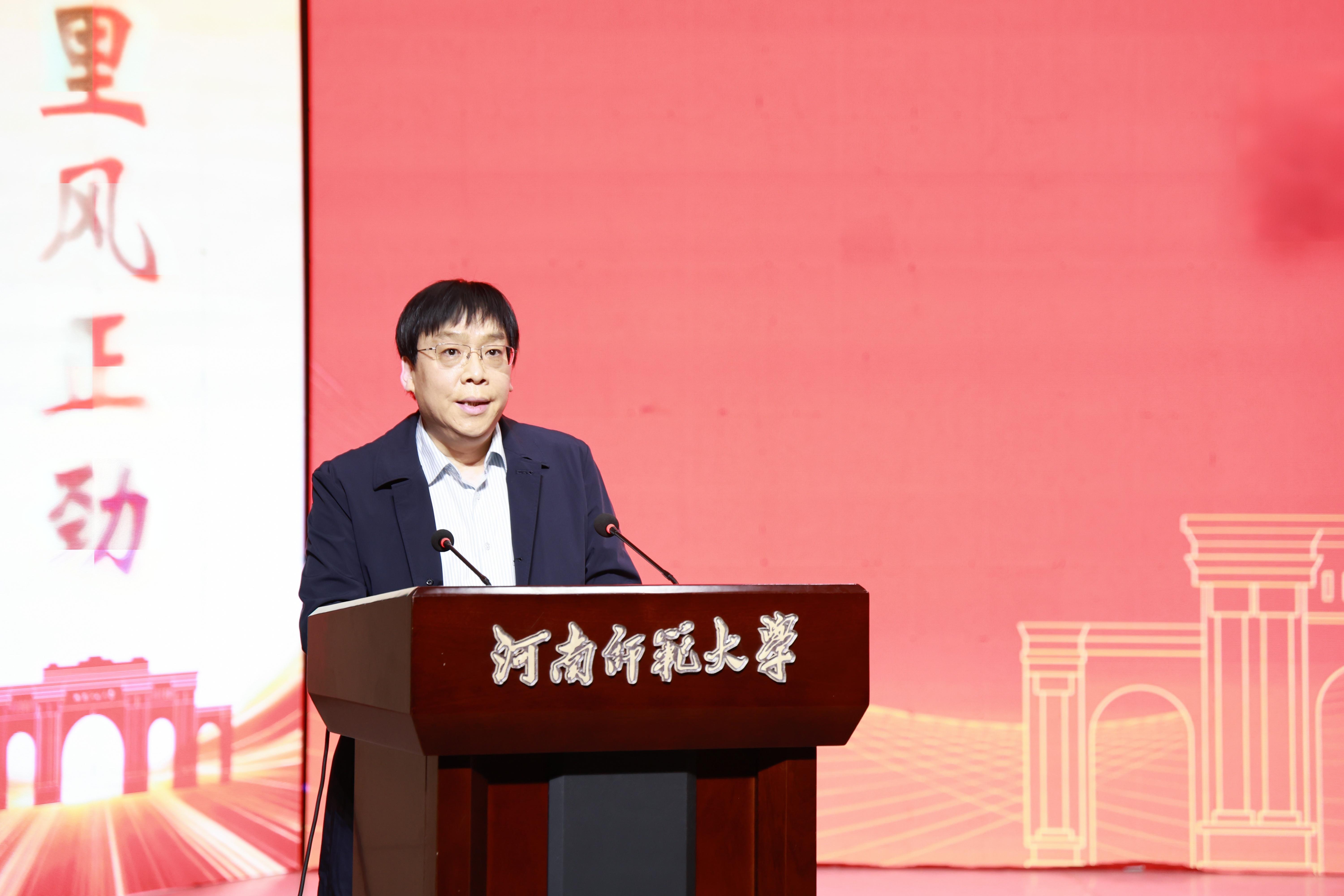 大会在师生共同观看年度学生工作回顾视频《铸魂育人守初心·奋斗青春正当时》中拉开帷幕,副校长宋晔宣读《河南师范大学2024-2025学年度学生工作表彰决定》。