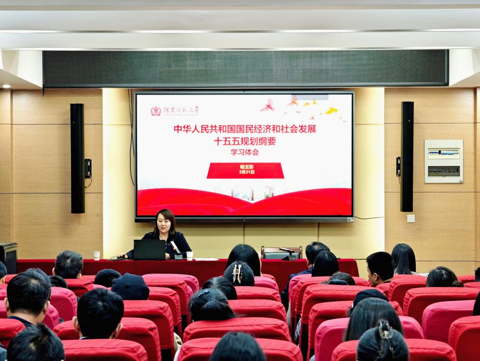3月31日下午,校党委常委、副校长杨玉珍教授在商学院119报告厅作学习贯彻全国两会精神专题辅导报告,深入解读“十五五”规划纲要。学院领导班子成员、全体教职工参加学习。会议由商学院党委书记常晓丽主持。