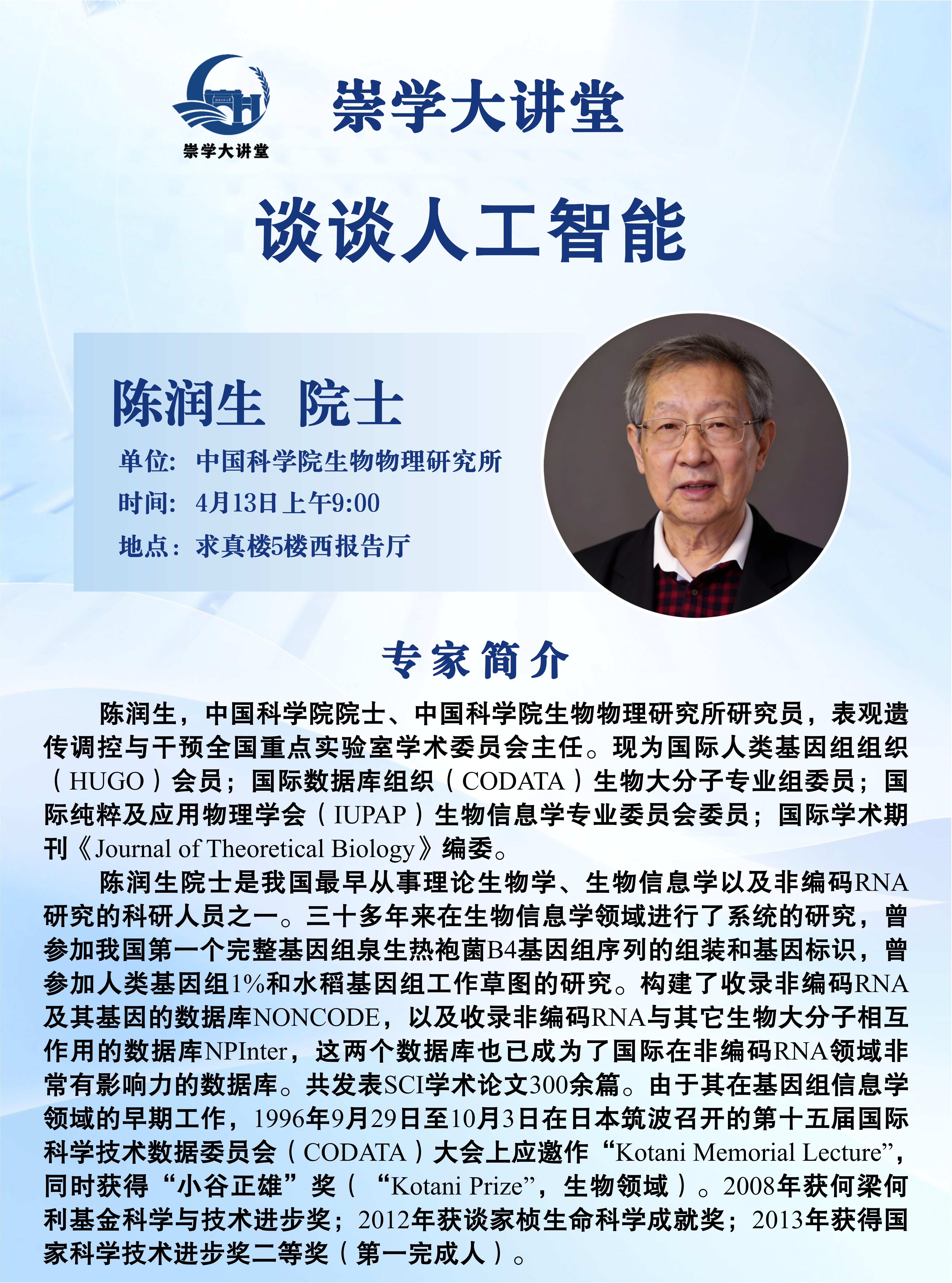 中国科学院生物物理研究所陈润生院士将应邀做客“崇学大讲堂”