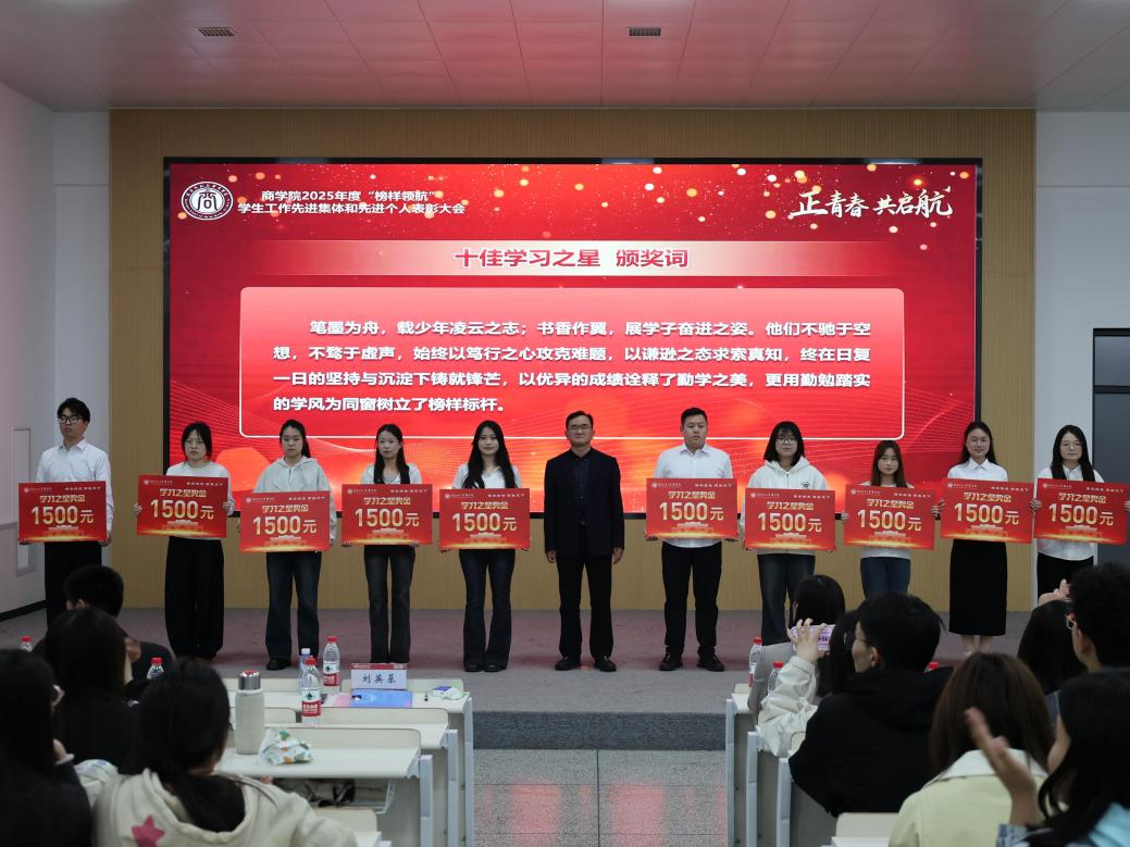 4月8日下午,商学院在树蕙堂举行“正青春 共启航”2025年度“榜样领航”学生工作表彰大会。学院领导班子成员、全体专兼职辅导员、获奖及学生代表参加会议。