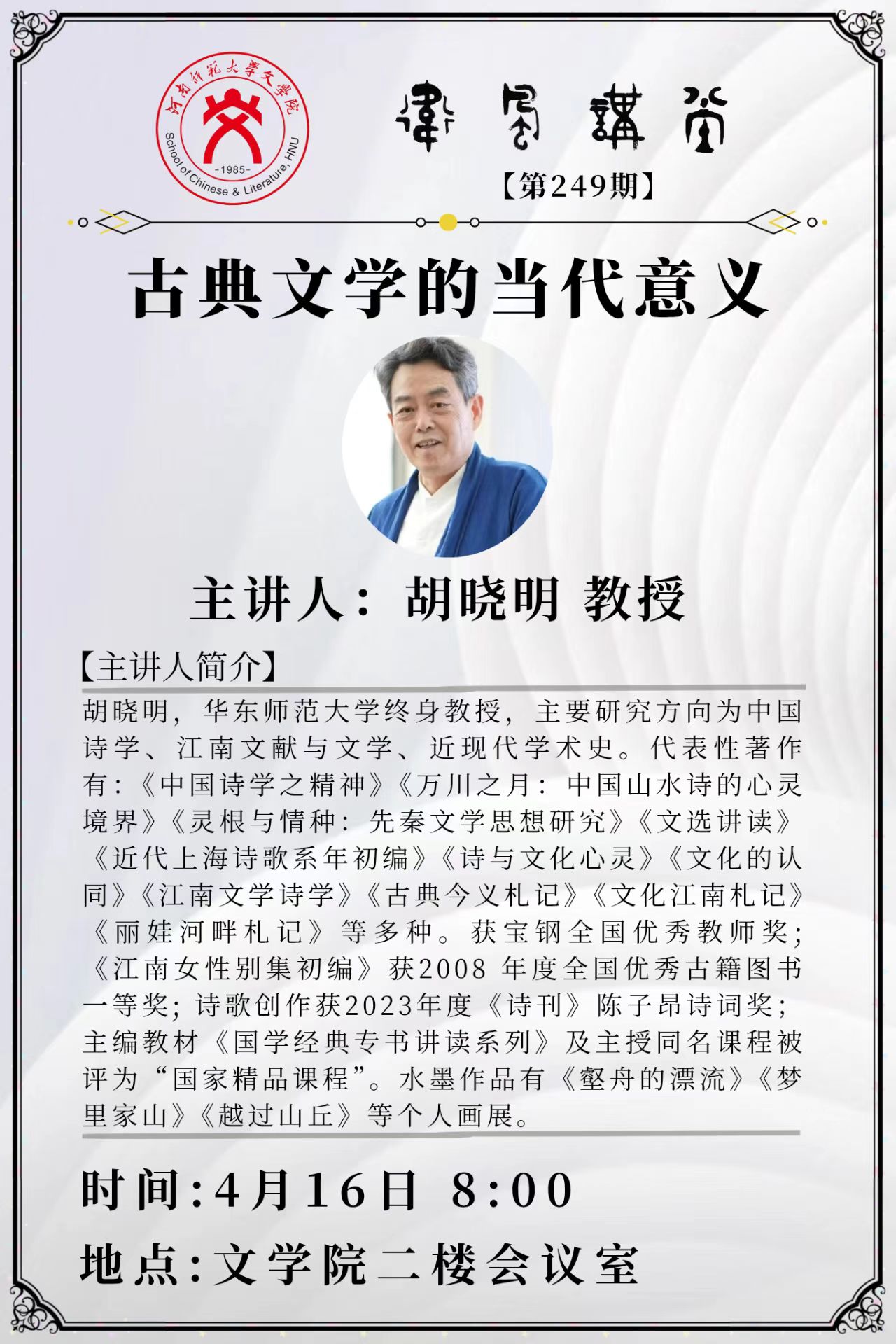 华东师范大学胡晓明教授将应邀做客“卫风讲堂”